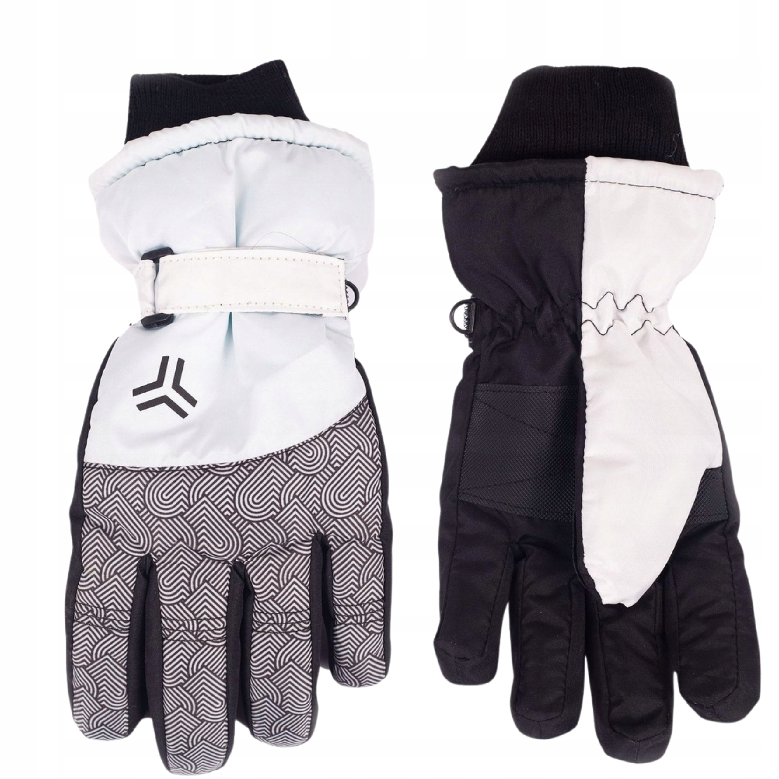 Лыжные перчатки для девочек белого и черного цвета с сердечным мотивом. Внутренняя сторона перчатки отделана красивым пухом.