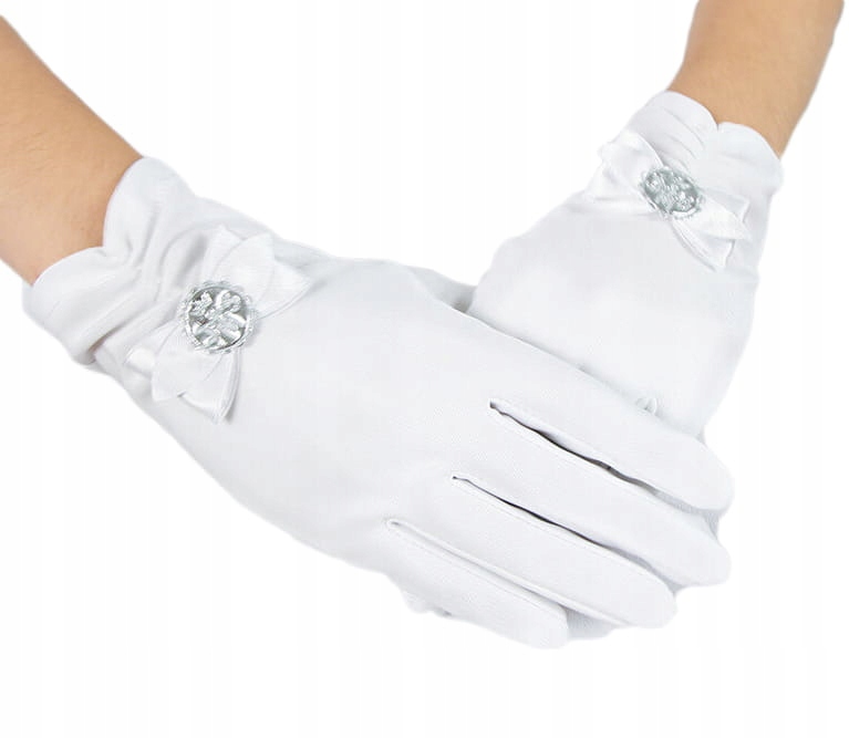 Перчатки для причастия пятипалые, из гладкого и эластичного атласа. Слегка присборено внизу, декорировано изящным бантиком с булавкой IHS. Благодаря своему элегантному внешнему виду они станут украшением любого платья или альбома.