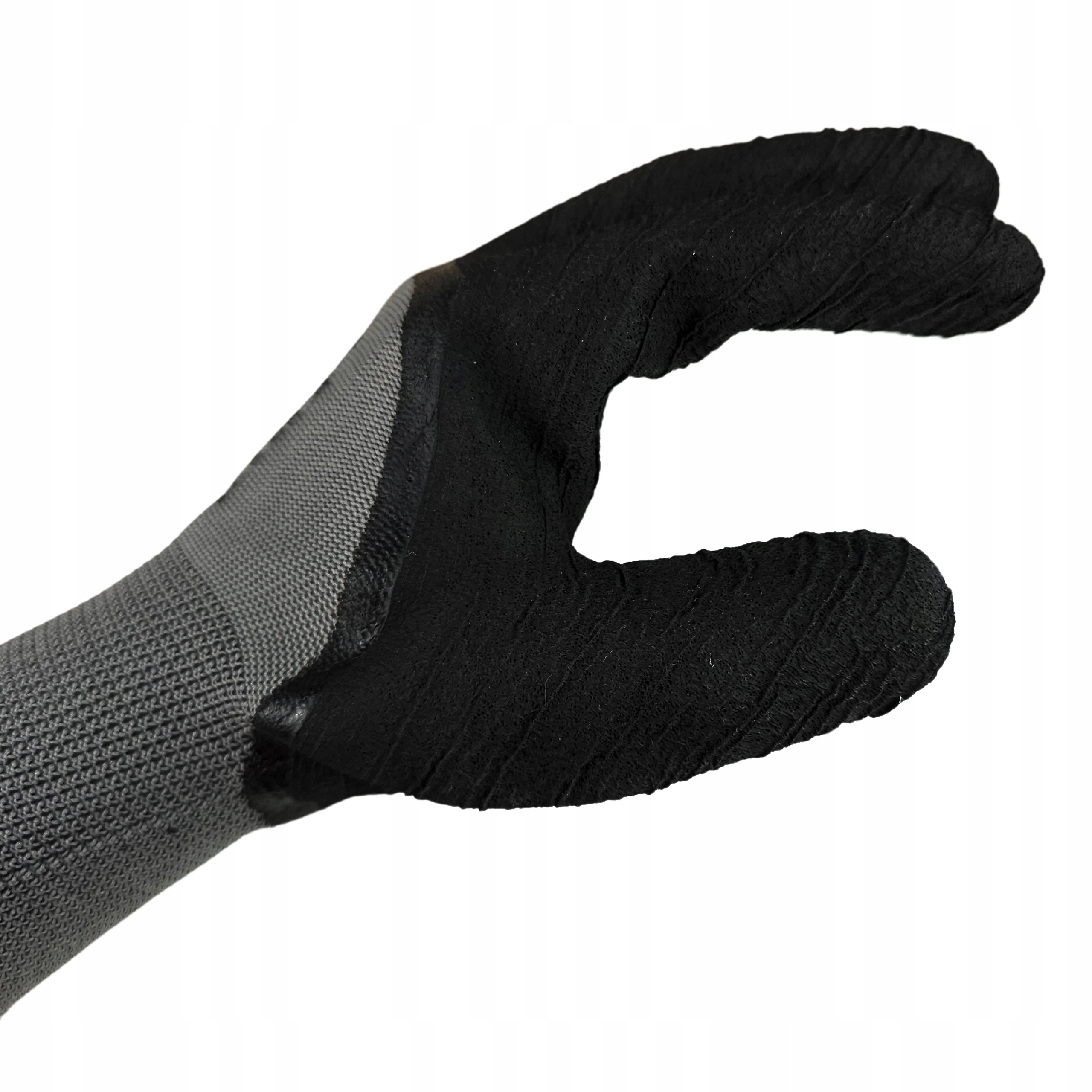 ✅ Из полиэфирного трикотажа серого цвета, покрытая на 3/4 части перчатки черным вспененным латексом типа «GRIP», готовая с манжетой перчатки характеризуются долговечностью и прочностью.