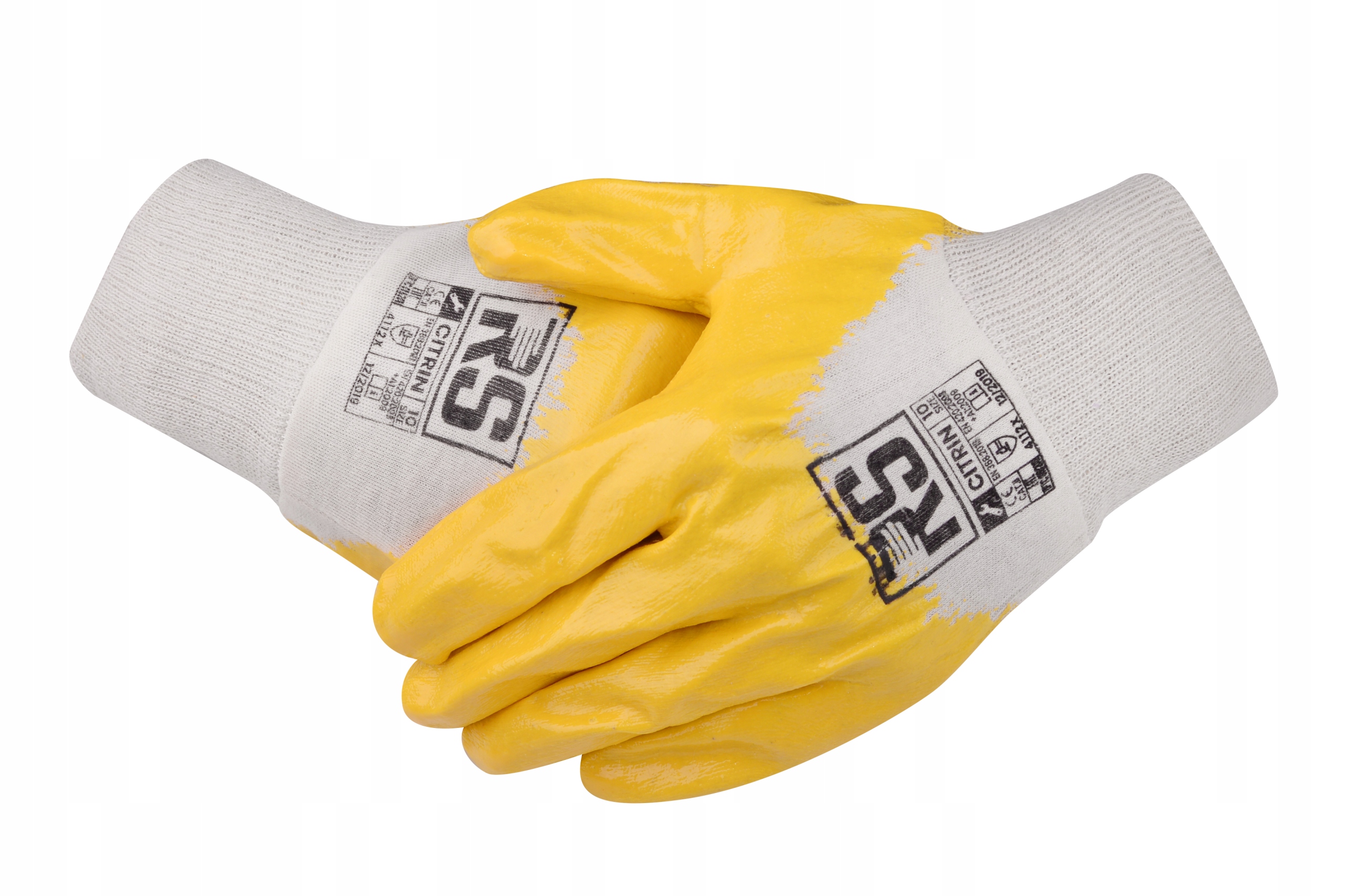 RS Citrin — это хлопчатобумажные рабочие перчатки, покрытые до середины руки желтым нитрилом.