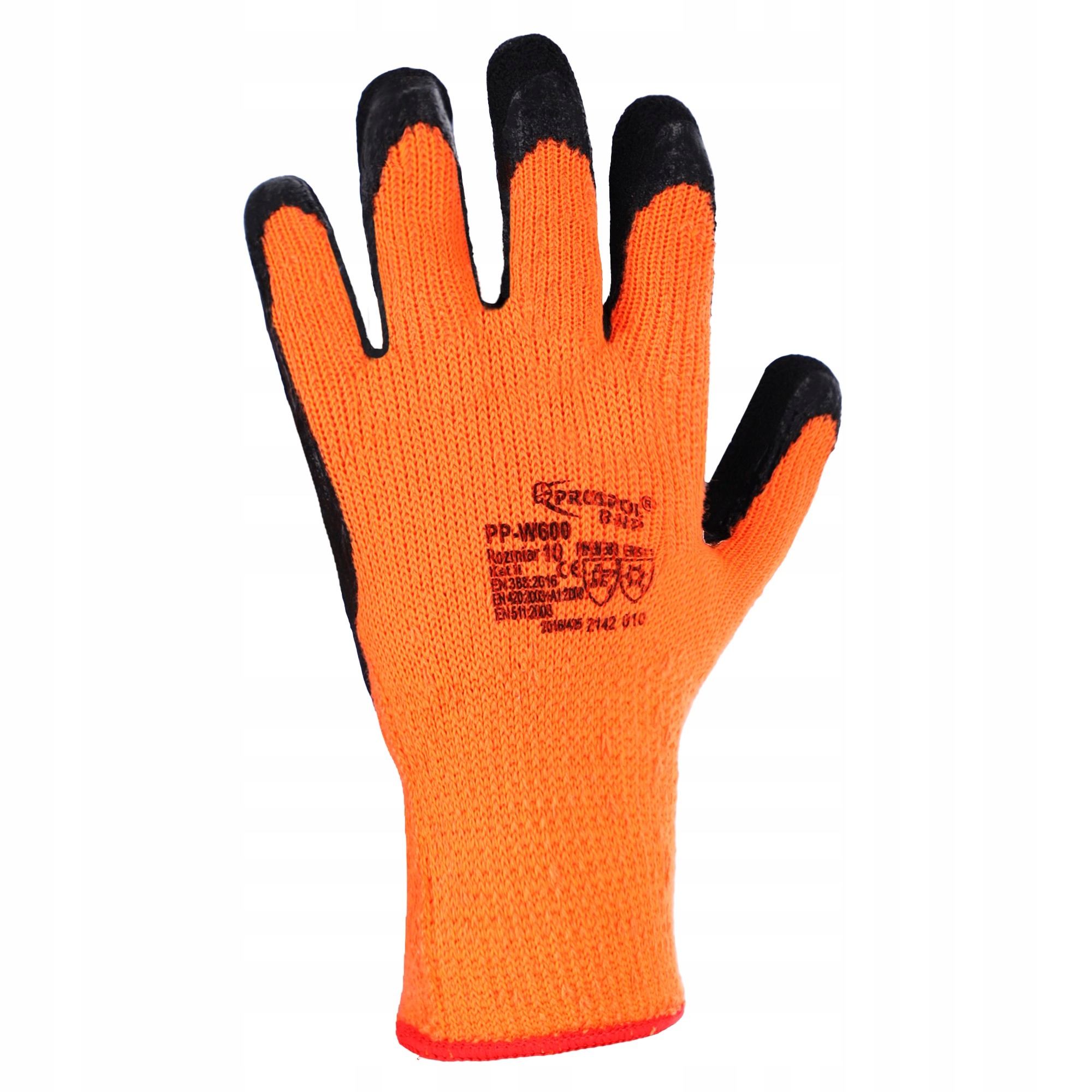 Перчатки рабочие защитные трикотажные из полиэстера с акрилом, утепленные, оранжевого цвета, с покрытием на ладони черным вспененным латексом.