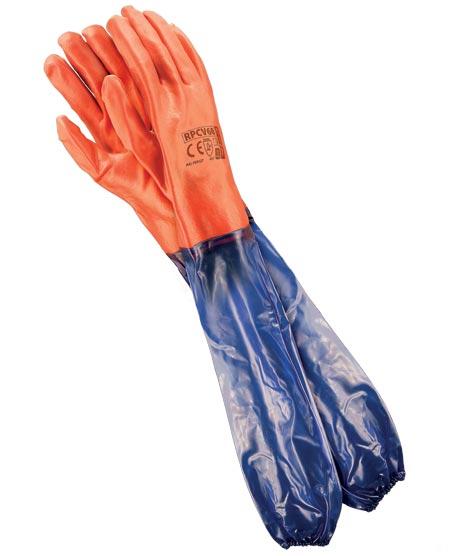 Защитные перчатки из ПВХ, отделаны рукавом.