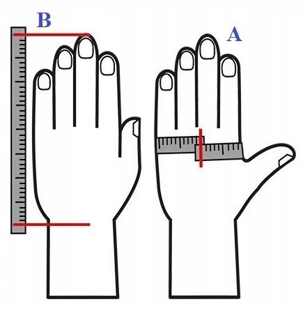 Измерьте длину среднего пальца (размер А) и окружность руки (размер Б). Перчатки доступны в следующих размерах: