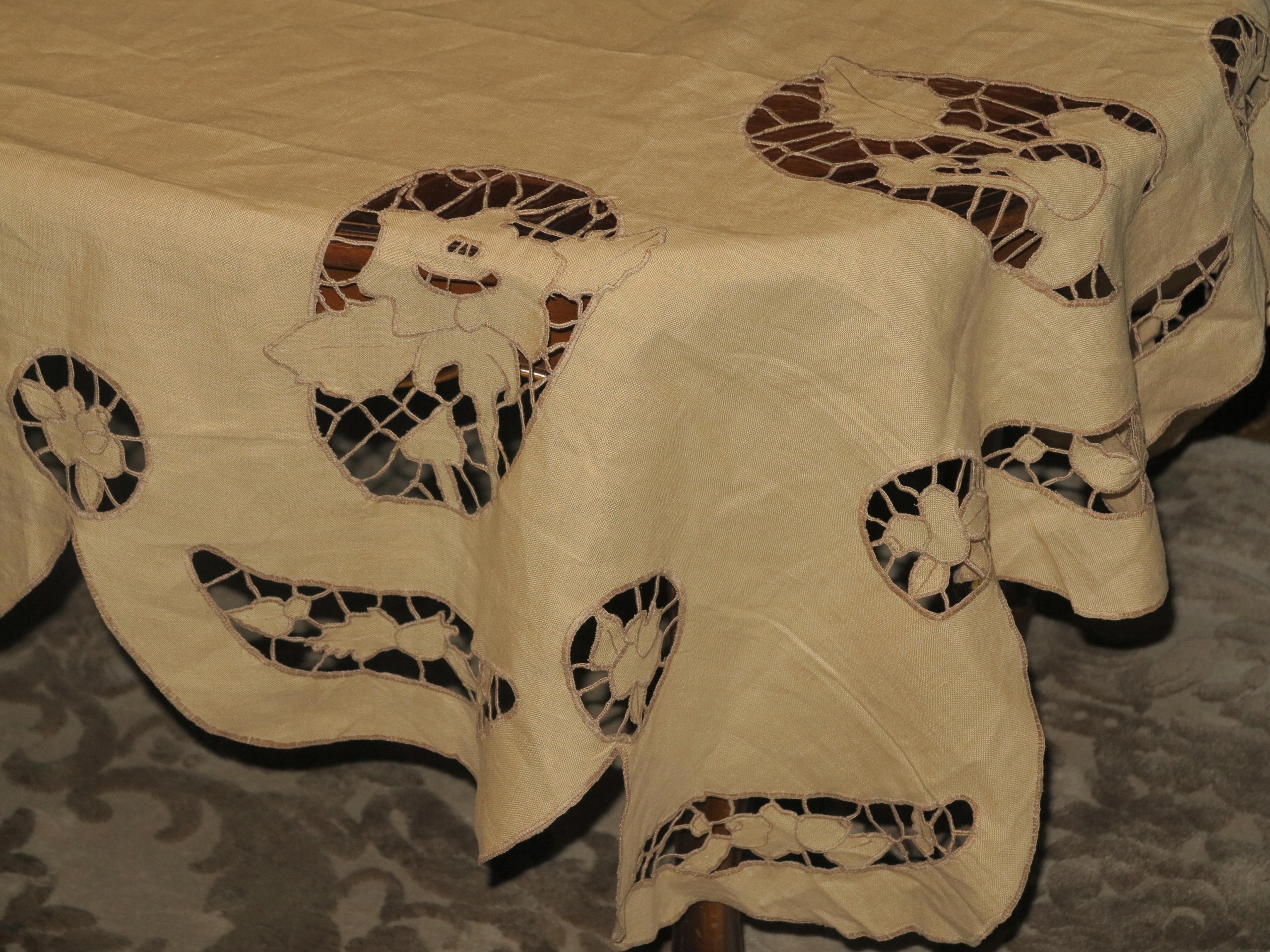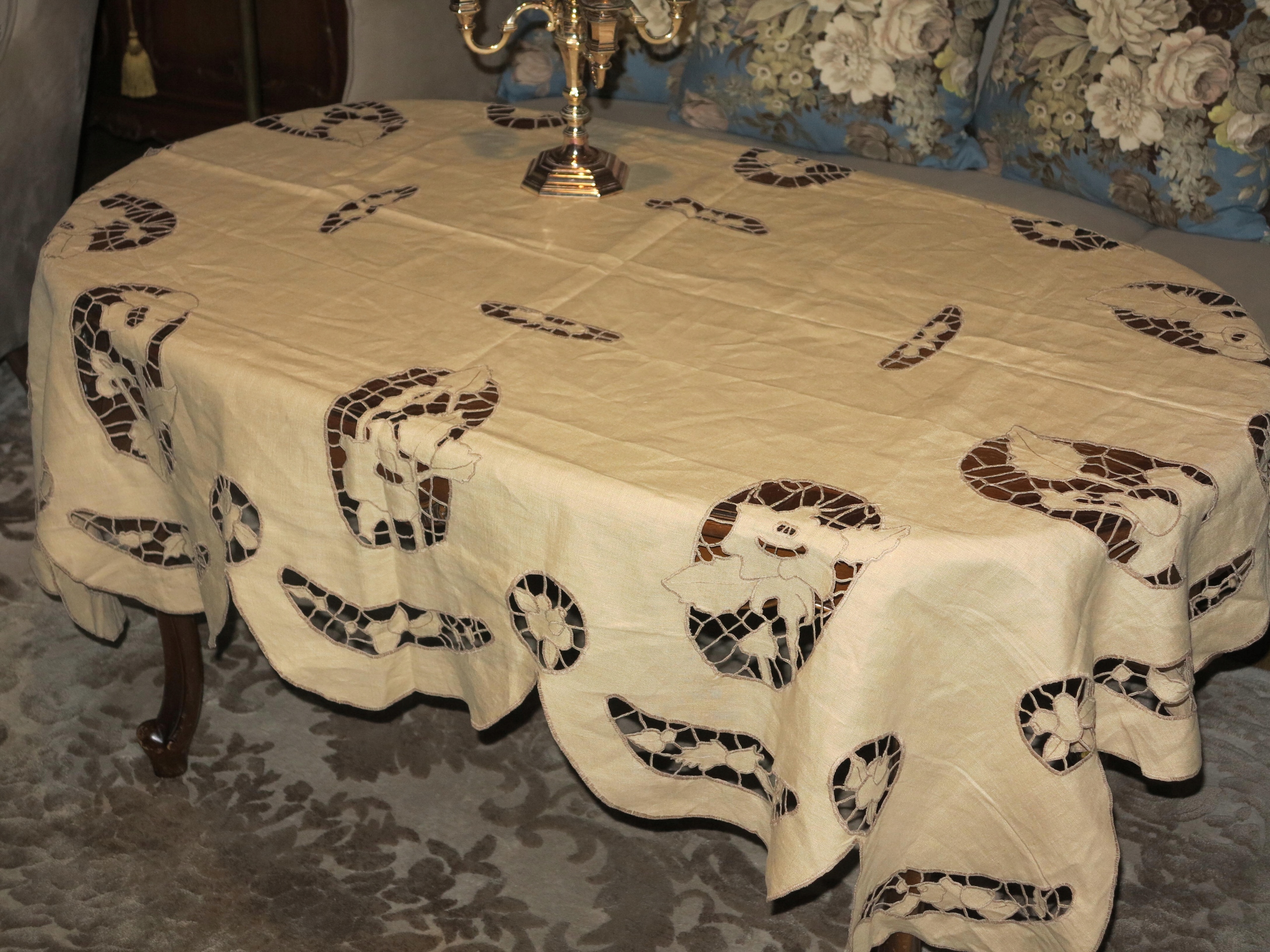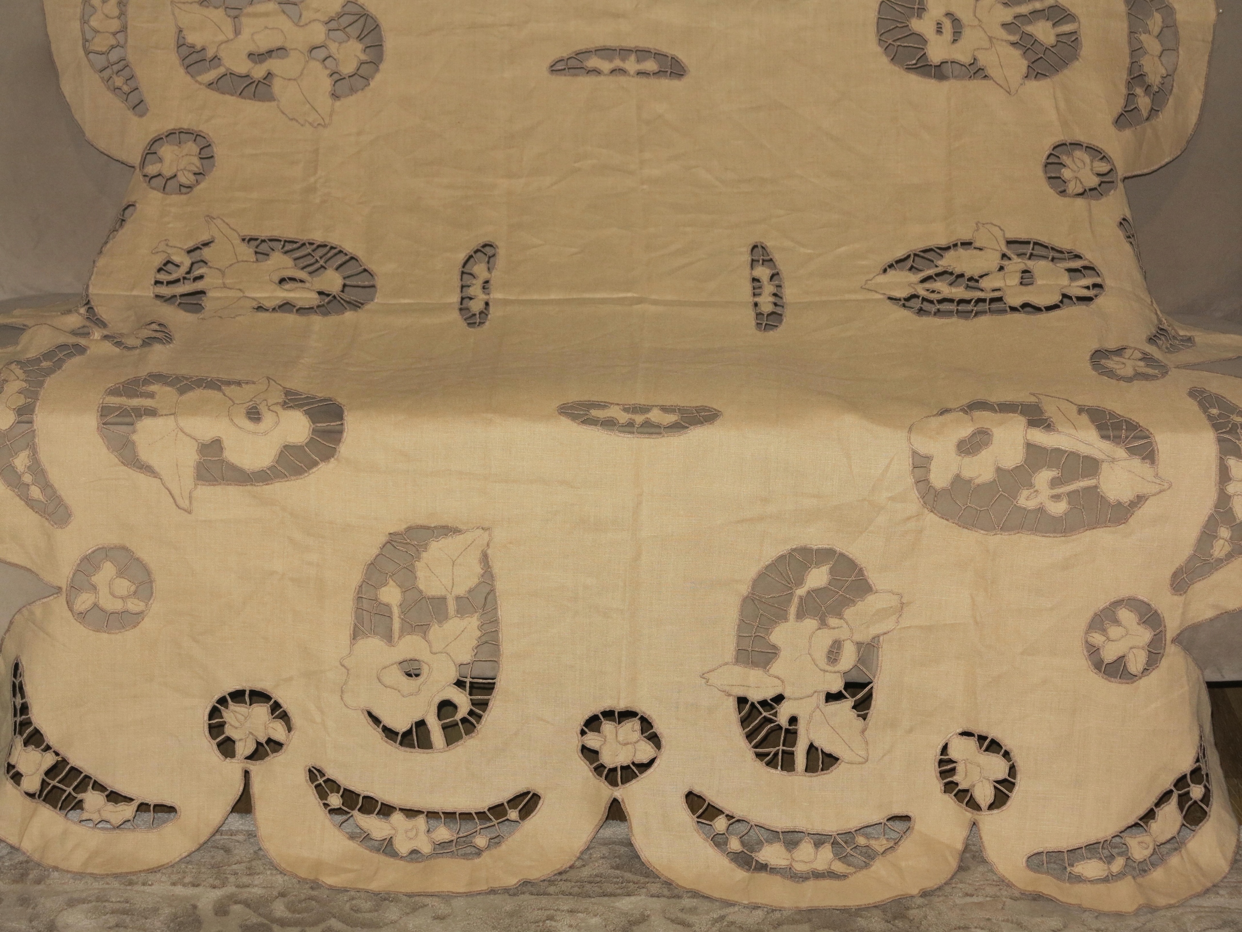 ОЧЕНЬ КРАСИВАЯ ЛЬНЯНАЯ СКАТЕРТЬ, ПОЛНОСТЬЮ РУЧНАЯ РАБОТА, С ВЫШИВКОЙ РИЧЕЛЬЕ И АЖУРОМ. ИМЕЕТ ИНТЕРЕСНУЮ, ДЕКОРАТИВНУЮ ФОРМУ. ТЁПЛЫЙ БЕЖЕВЫЙ ЦВЕТ