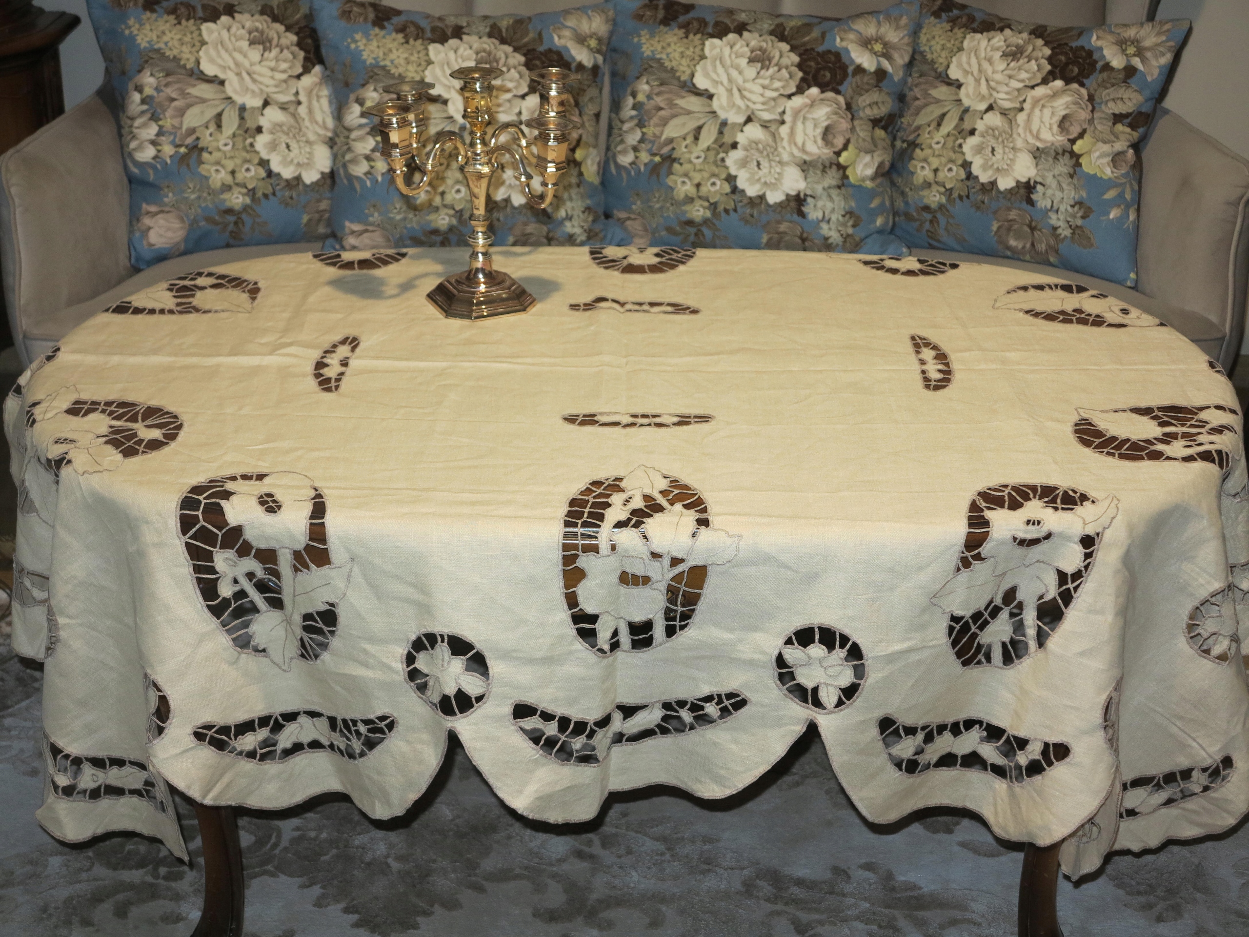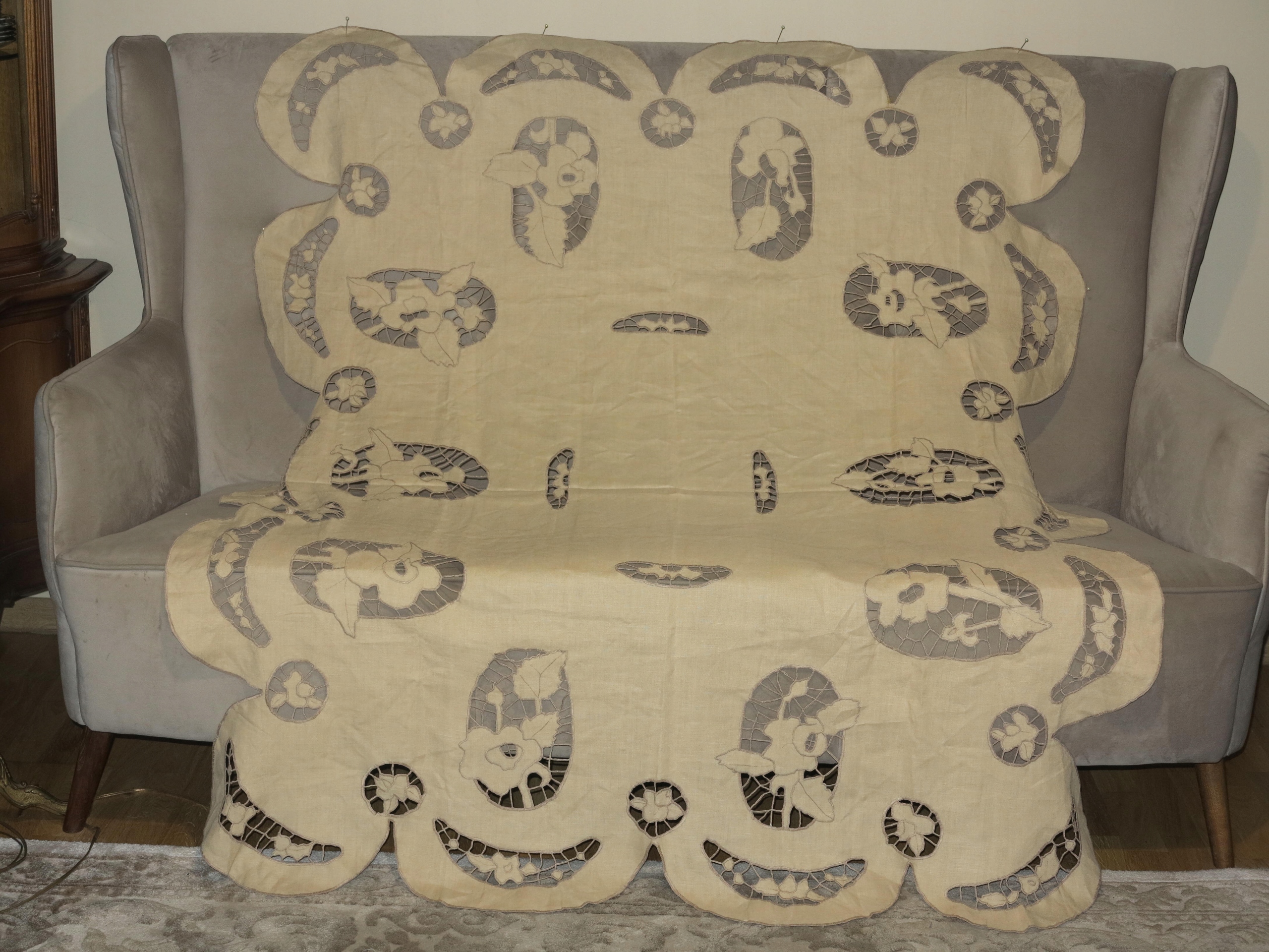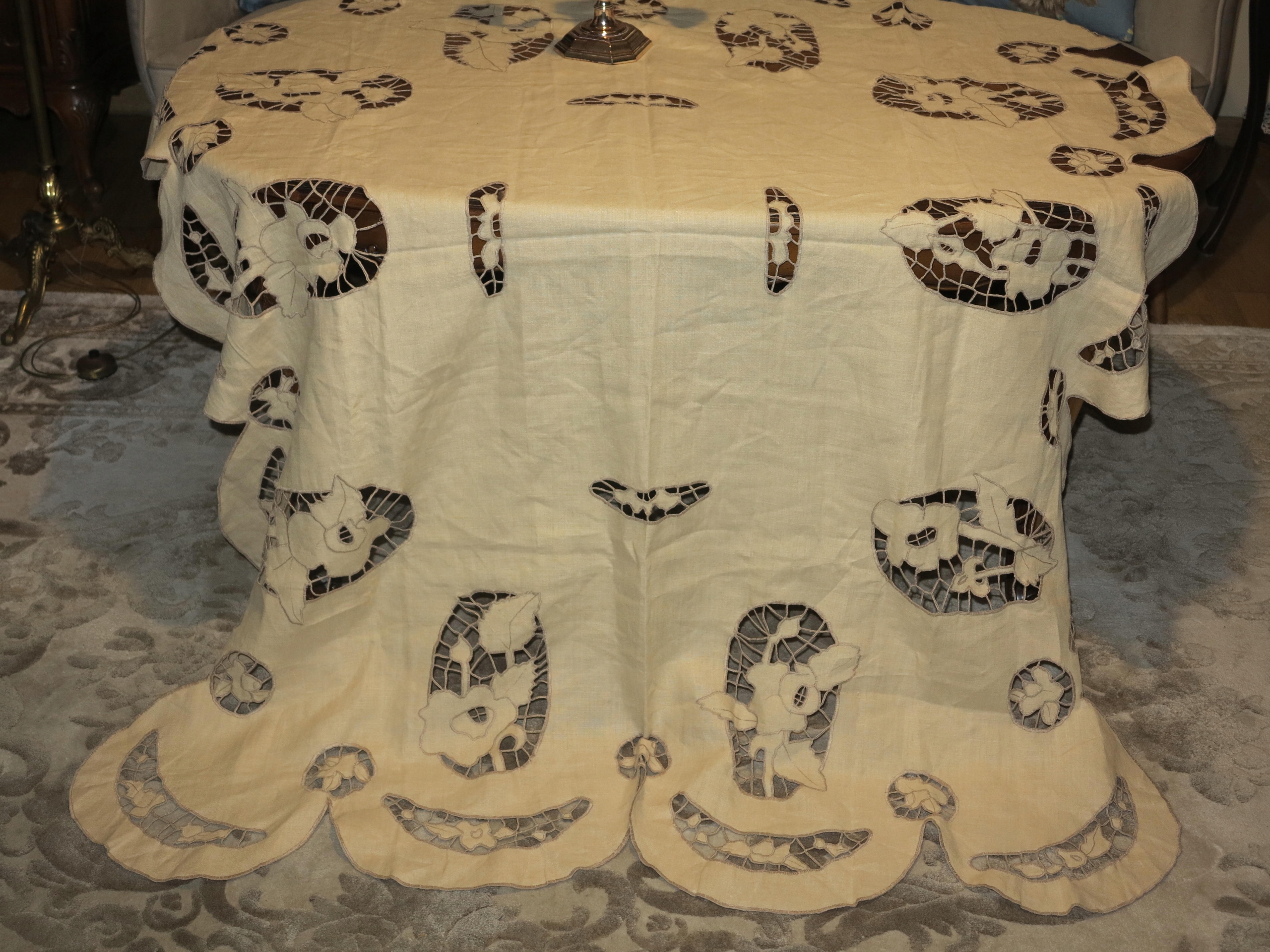 ОЧЕНЬ КРАСИВАЯ ЛЬНЯНАЯ СКАТЕРТЬ, ПОЛНОСТЬЮ РУЧНАЯ РАБОТА, С ВЫШИВКОЙ РИЧЕЛЬЕ И АЖУРОМ. ИМЕЕТ ИНТЕРЕСНУЮ, ДЕКОРАТИВНУЮ ФОРМУ. ТЁПЛЫЙ БЕЖЕВЫЙ ЦВЕТ