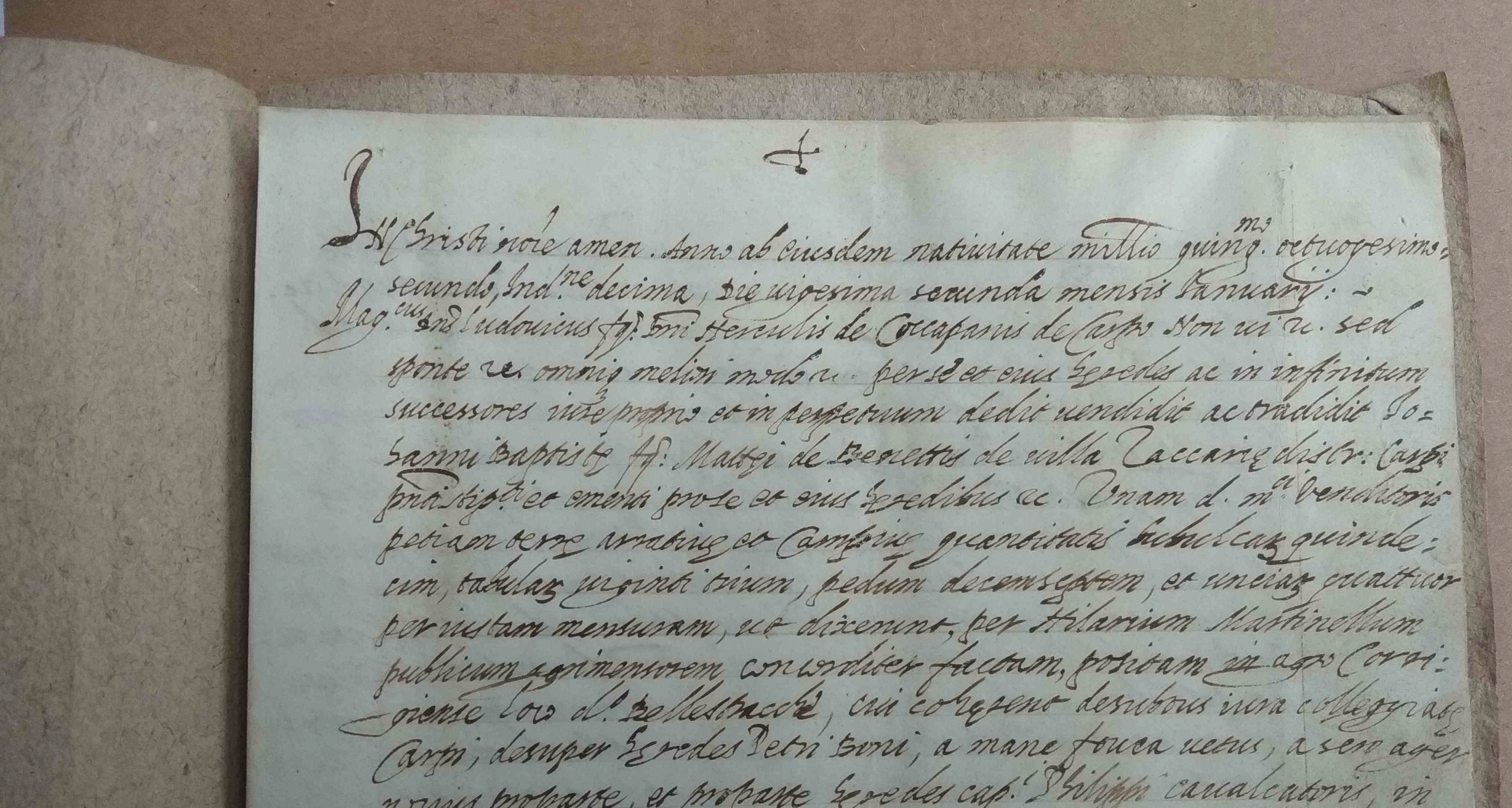 Документ касается продажи одного участка (части) пахотной земли (лат. petiam terre) Луи, сын Эркюля де Куапани. Покупателем был Иоанн Баптиста, сын Матфея де Бенеттиса из деревни Заккария близ Карпи.
