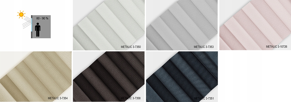 МЕТАЛИК - ткань, покрытая с обеих сторон металлическим слоем, что значительно улучшает теплоизоляцию складки (за счет отражения солнечных лучей), поэтому идеально подходит для чердаков и для использования там, где есть излишки солнце. Текстура ткани гладкая и имеет металлический вид. Светлый материал осветит помещение и затемнит его примерно на 60%. Темные материалы затемнят комнату до 90%.