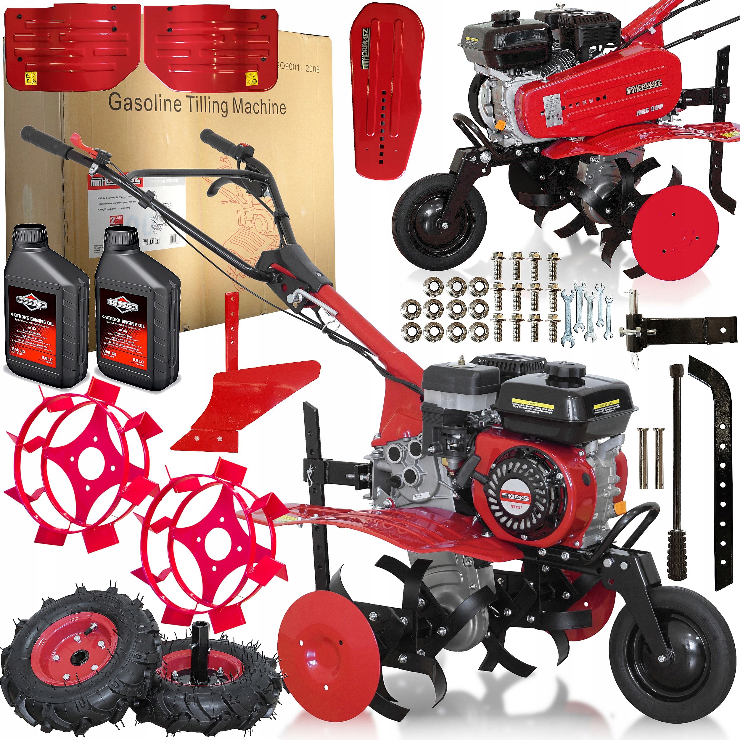 Бензиновый ротаватор HGS 500 прочная и компактная машина, предназначенная для работы в любых условиях и в любом саду. На мотоблоке установлен верхнеклапанный двигатель объемом 196 куб.см, с чугунной гильзой цилиндра и масляно-воздушным фильтром. Румпель оснащен редуктором, позволяющим ножам работать на двух скоростях вперед и одной скорости назад. В базовую комплектацию и цену машины входят резиновые колеса, благодаря которым мы можем быстро превратить мотокультиватор в микротрактор, способный работать с плугом, окучником или экскаватором.