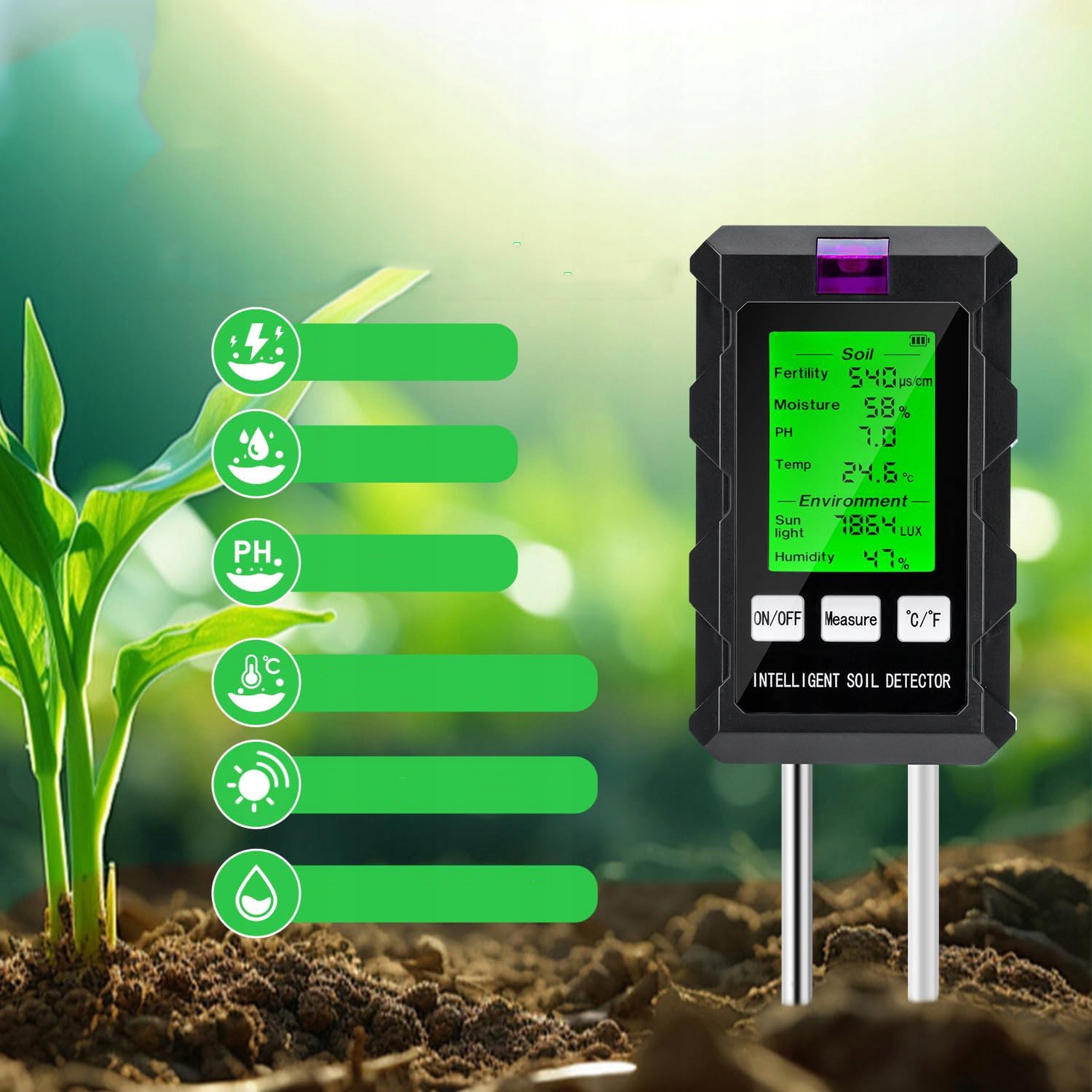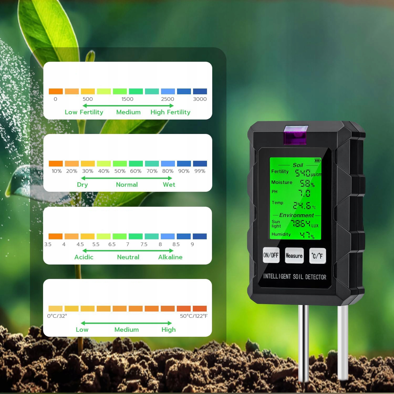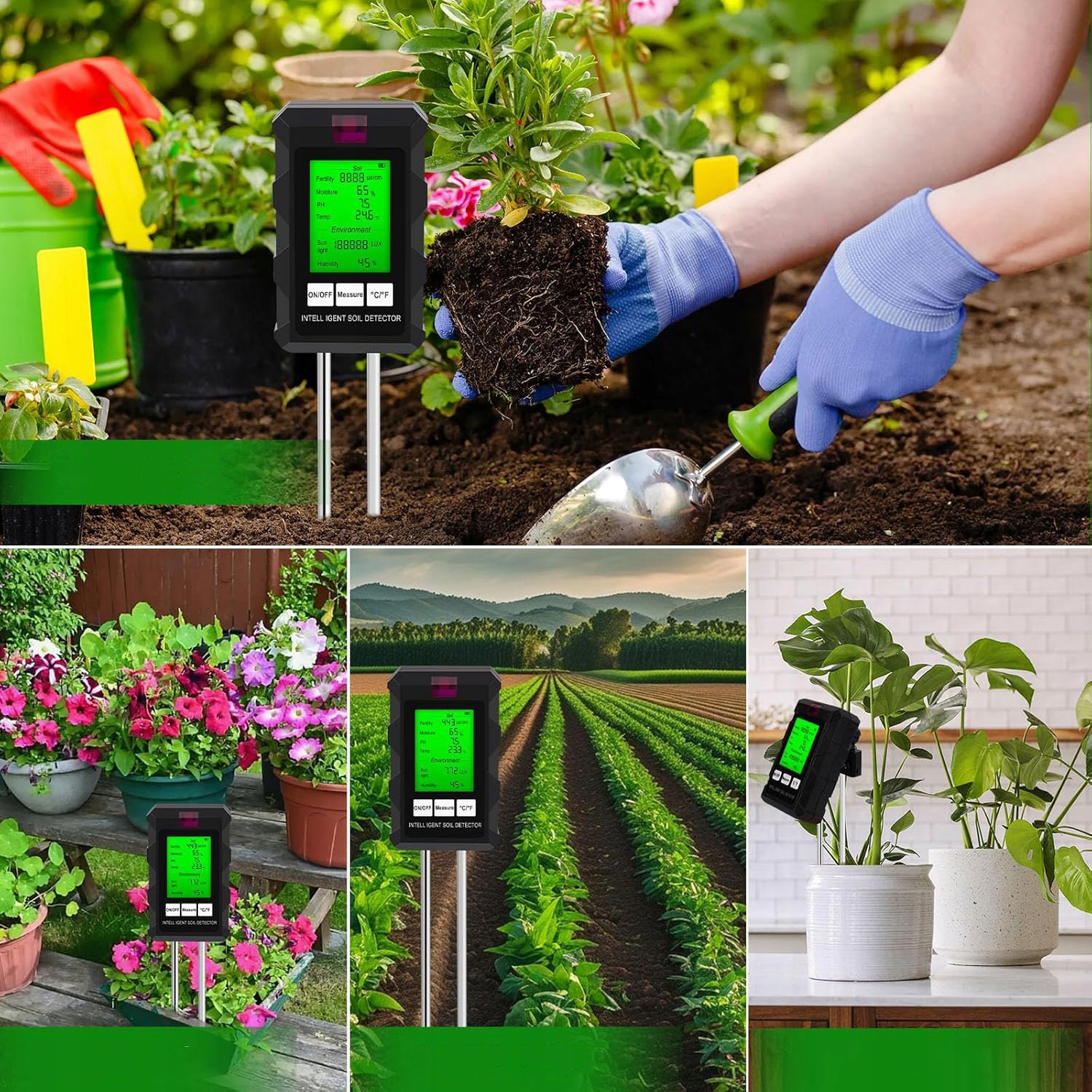 🌱🌱 Инновационная технология двойного зонда: Этот тестер почвы использует расширенную двойную систему двойного зонда с двойным холлой и долговечный алюминий. Чувствительный металлический зонд дает быстрые и надежные результаты, просто положите зонд и подождите несколько секунд, чтобы получить тщательное чтение. Если значение кажется ненормальным, может случиться, что пол плохо обертывает зонд. Рекомендуется ослабить землю и тестирование.