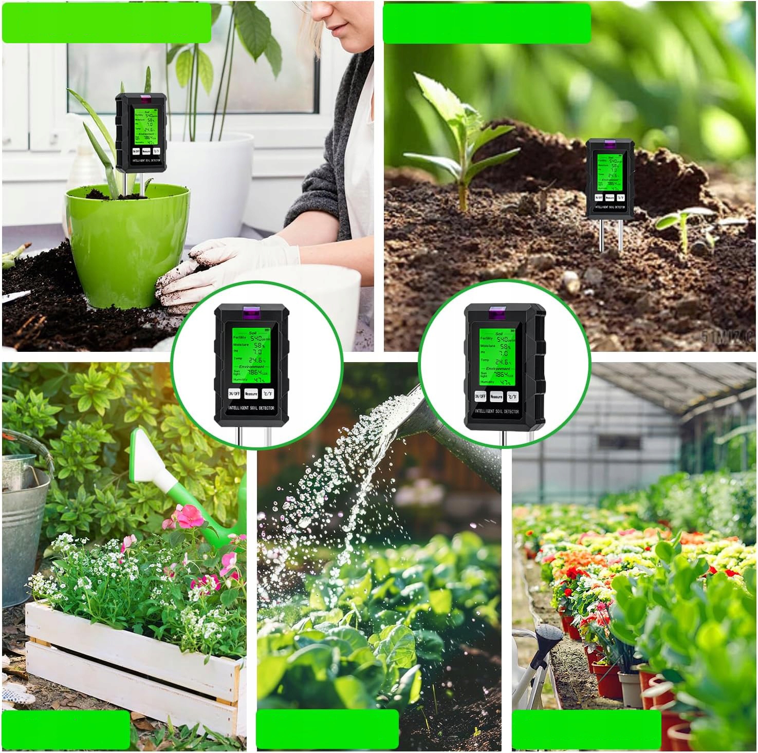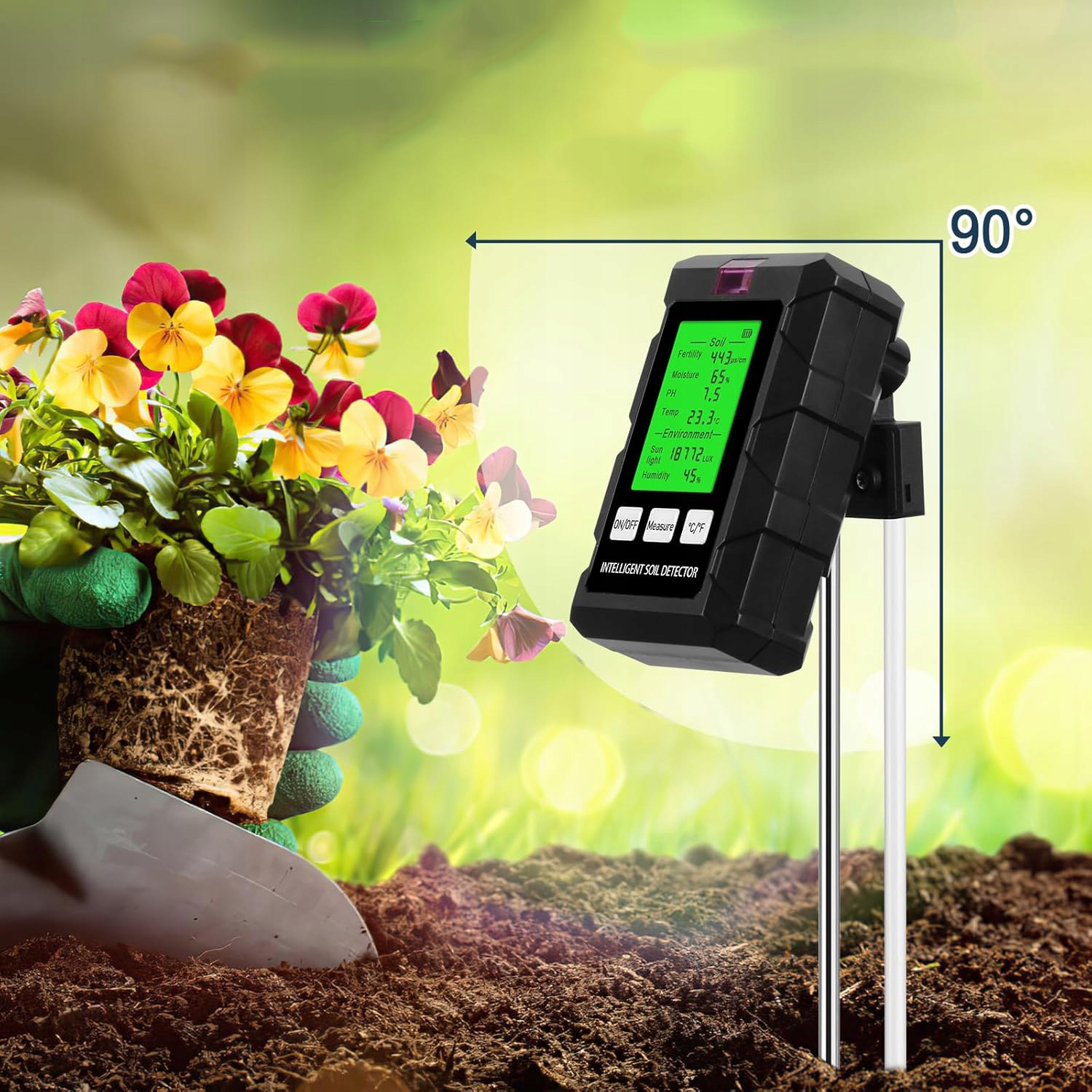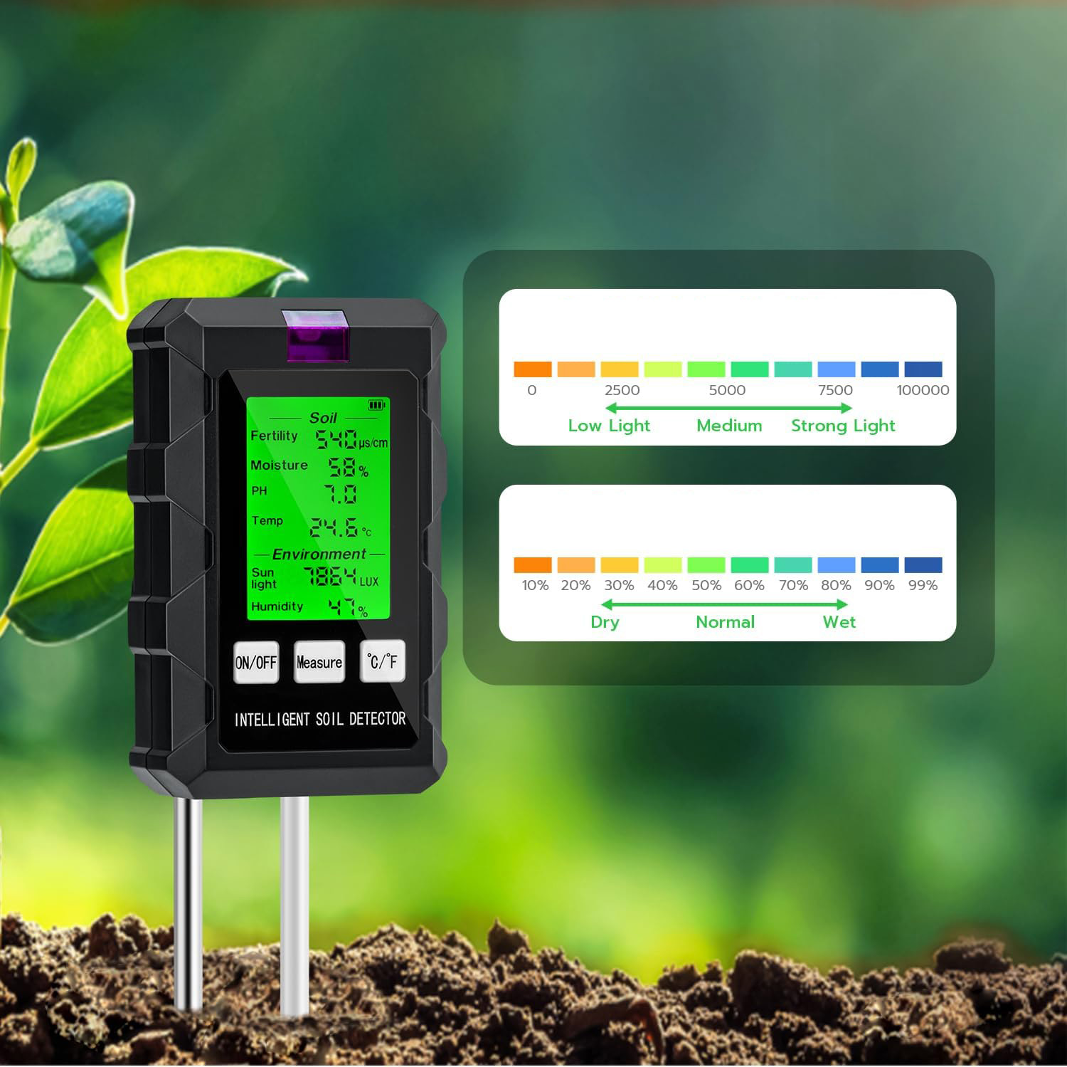 🌱🌱 Инновационная технология двойного зонда: Этот тестер почвы использует расширенную двойную систему двойного зонда с двойным холлой и долговечный алюминий. Чувствительный металлический зонд дает быстрые и надежные результаты, просто положите зонд и подождите несколько секунд, чтобы получить тщательное чтение. Если значение кажется ненормальным, может случиться, что пол плохо обертывает зонд. Рекомендуется ослабить землю и тестирование.