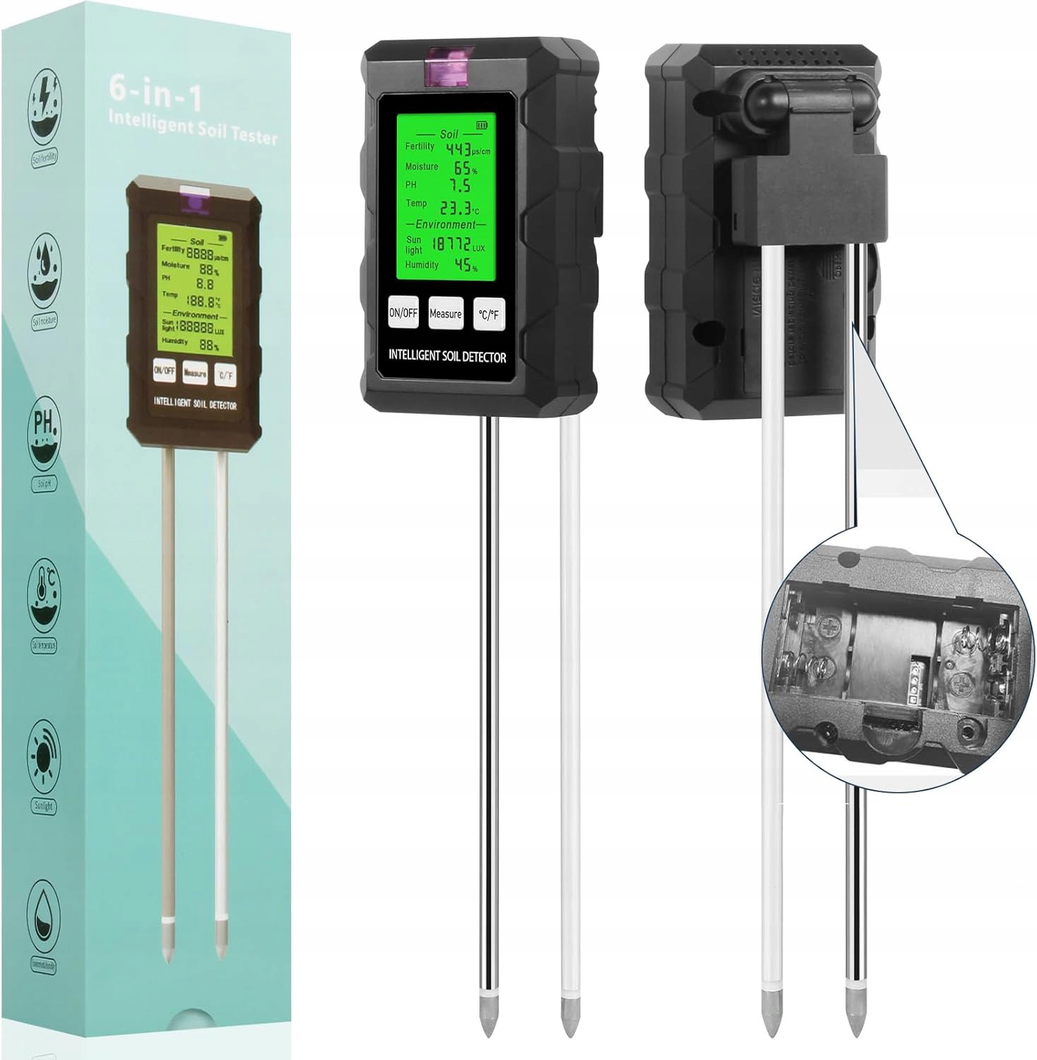 🌱🌱 Многофункциональный тестер почвы 6 в 1: Этот инструмент помогает контролировать шесть факторов, относящихся к растениям: влажность, рН, температура, фертильность, интенсивность света и влажность. Предоставляет точные реальные данные, идеально подходящие для садовников и фермеров. Этот продукт предназначен для глины и почвы, но не для порошков, камней, органических материалов или жидкостей. Не подходит для суккулентов / орхидеи.