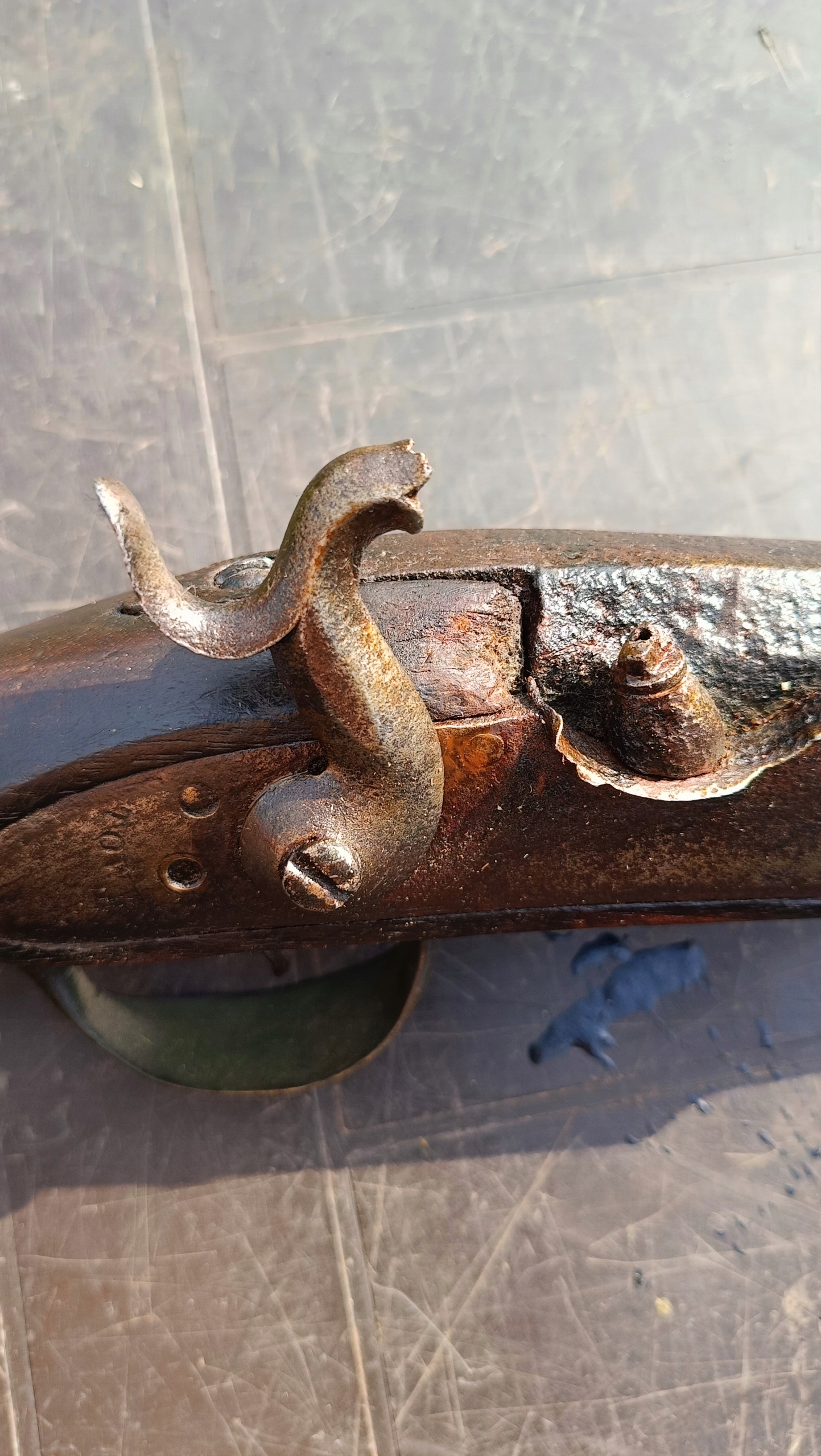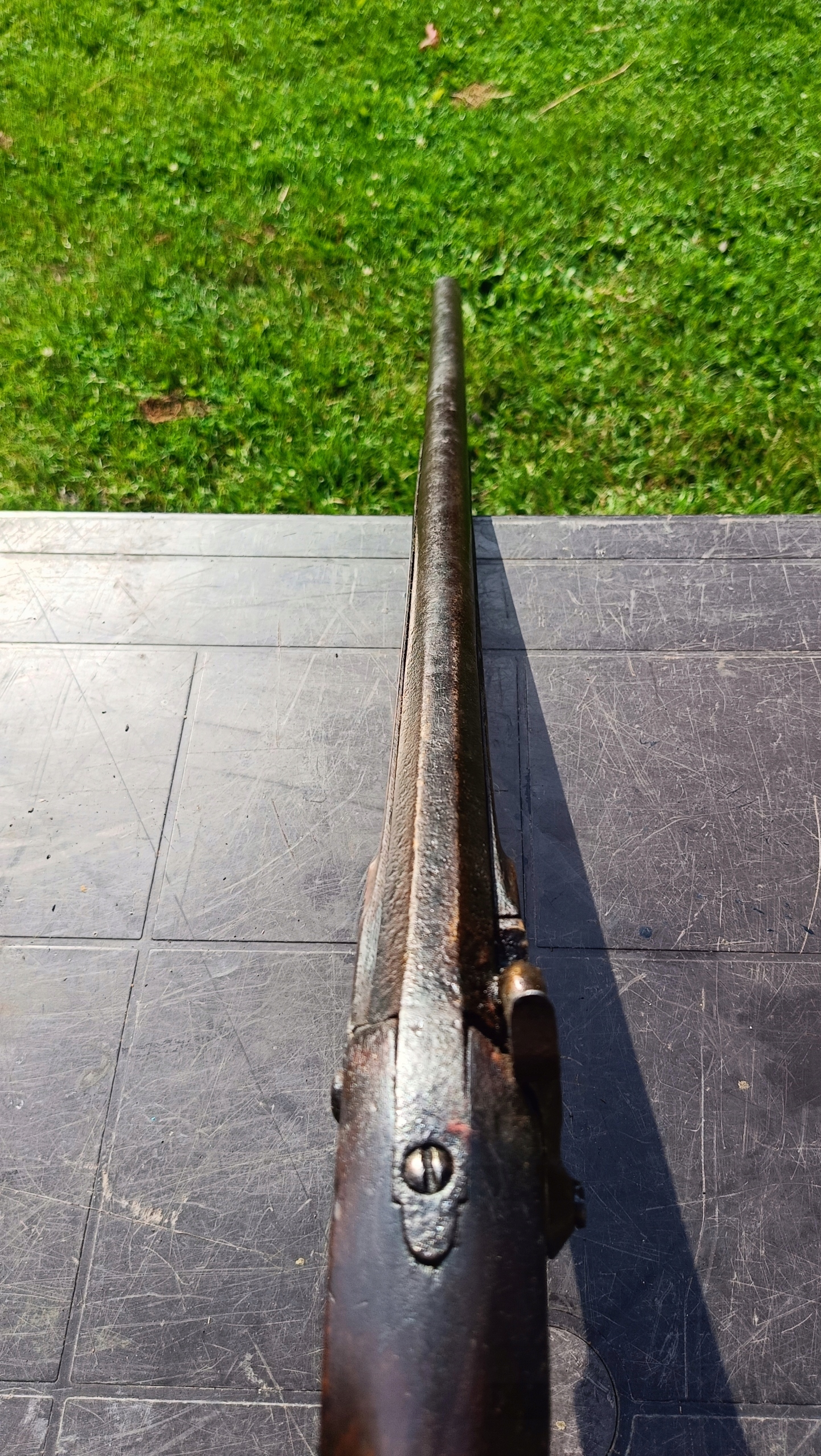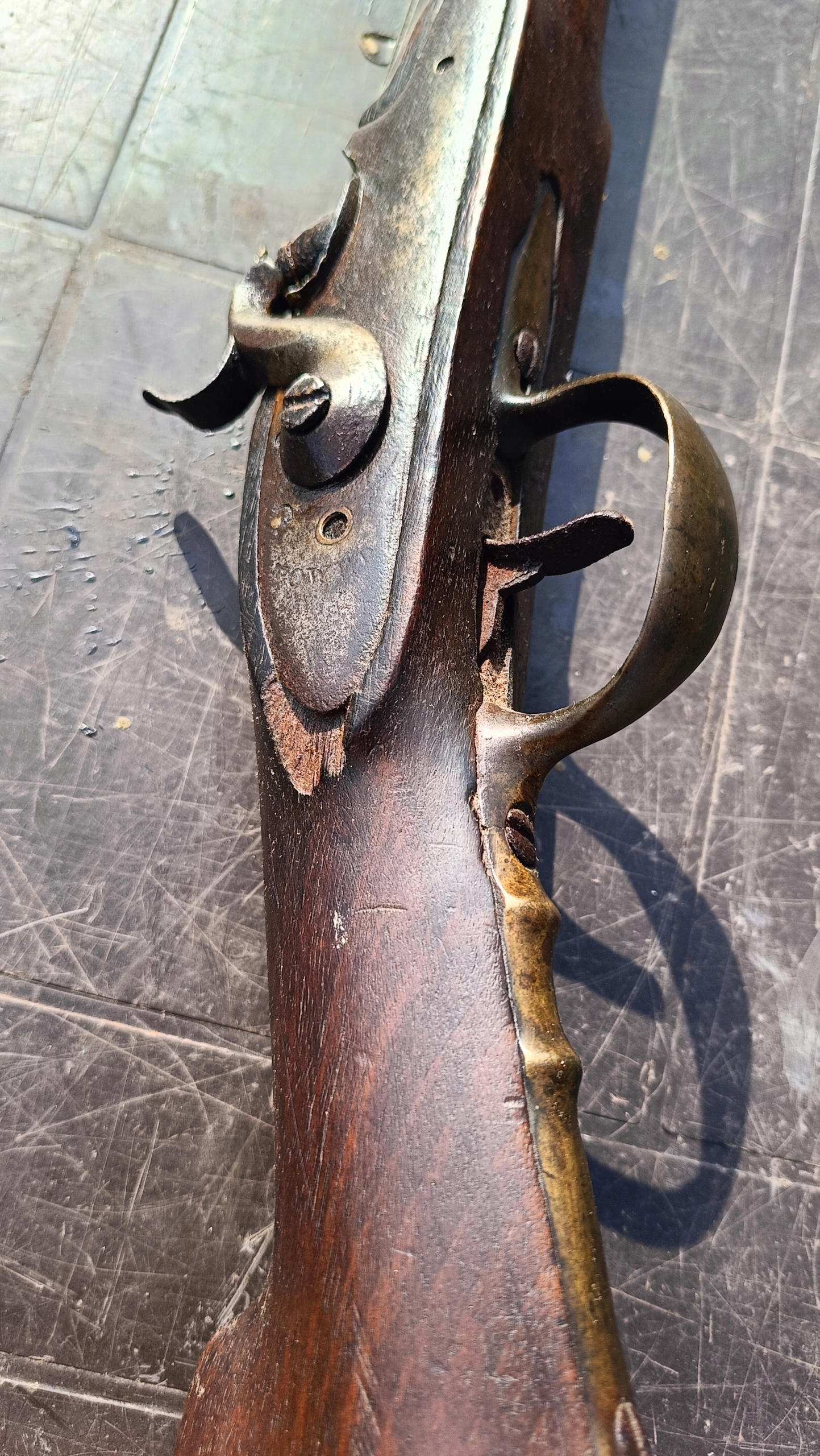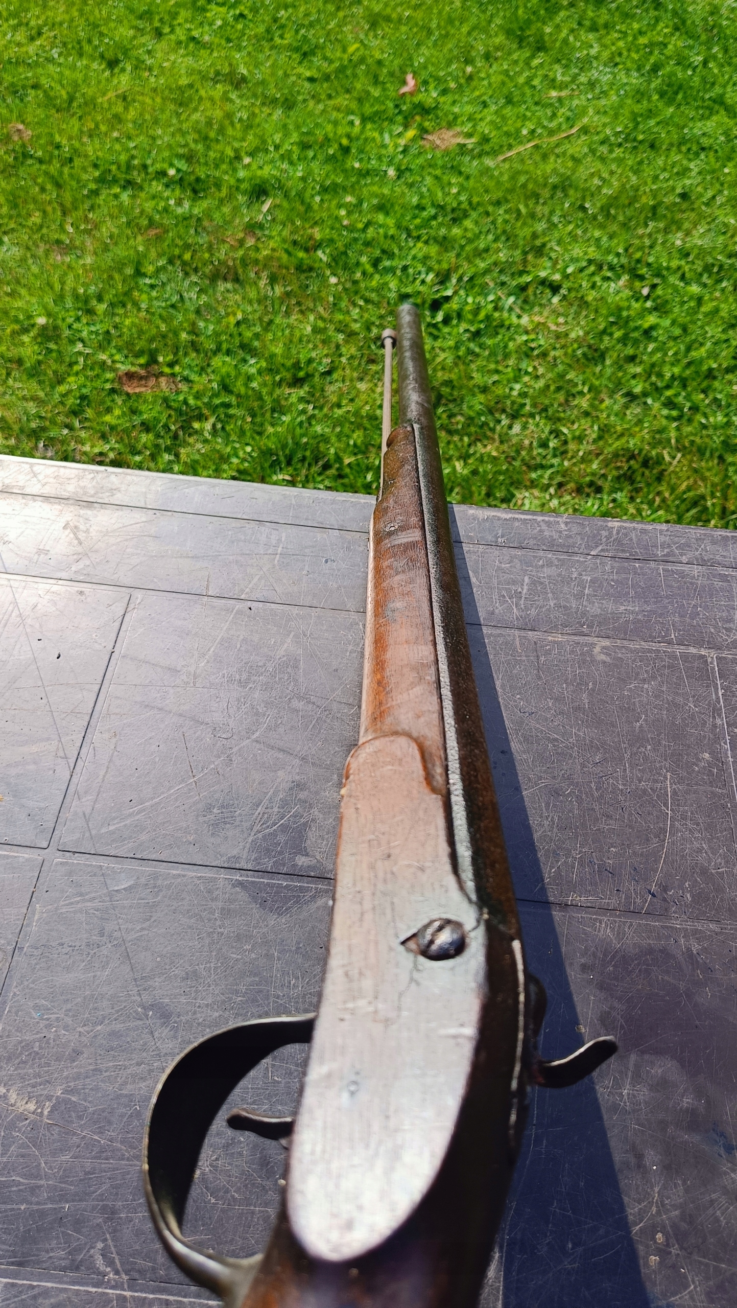 Загружается спереди. Можно стрелять сухим выстрелом, двойное натяжение – сильная пружина. Замок спускового крючка затягивается на 2 хода. Прямой ствол в хорошем состоянии. Дерево в хорошем состоянии. Камин сломан и требует замены – он не заблокирован. На конце ствола нет прицела, а ключица не оригинальная и слишком короткая, потому что больший размер не подойдет.
