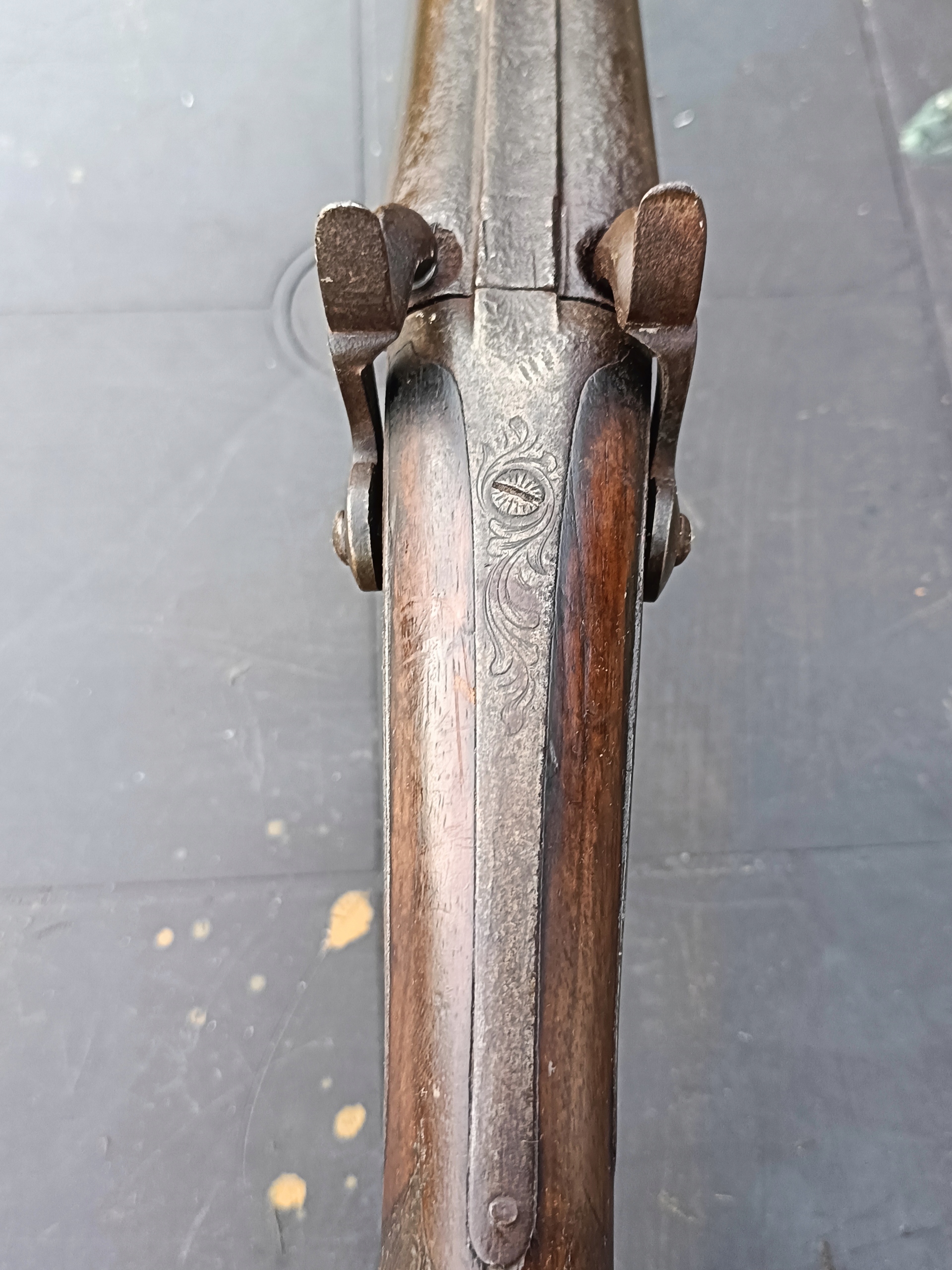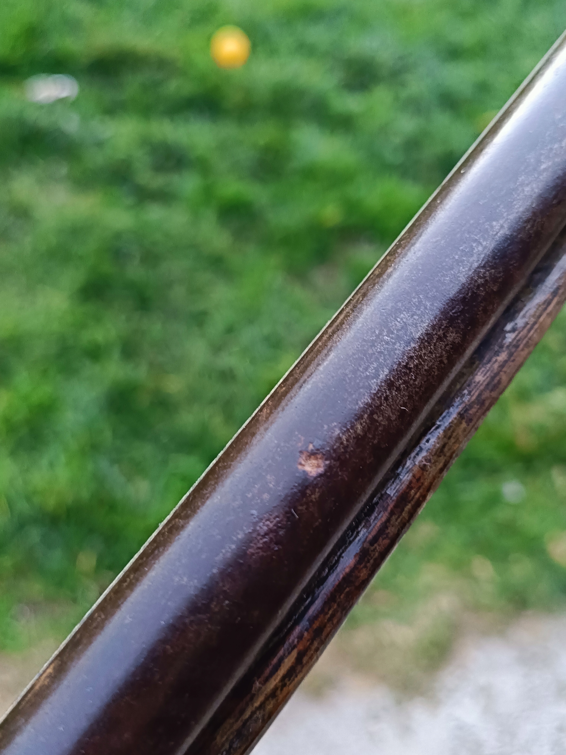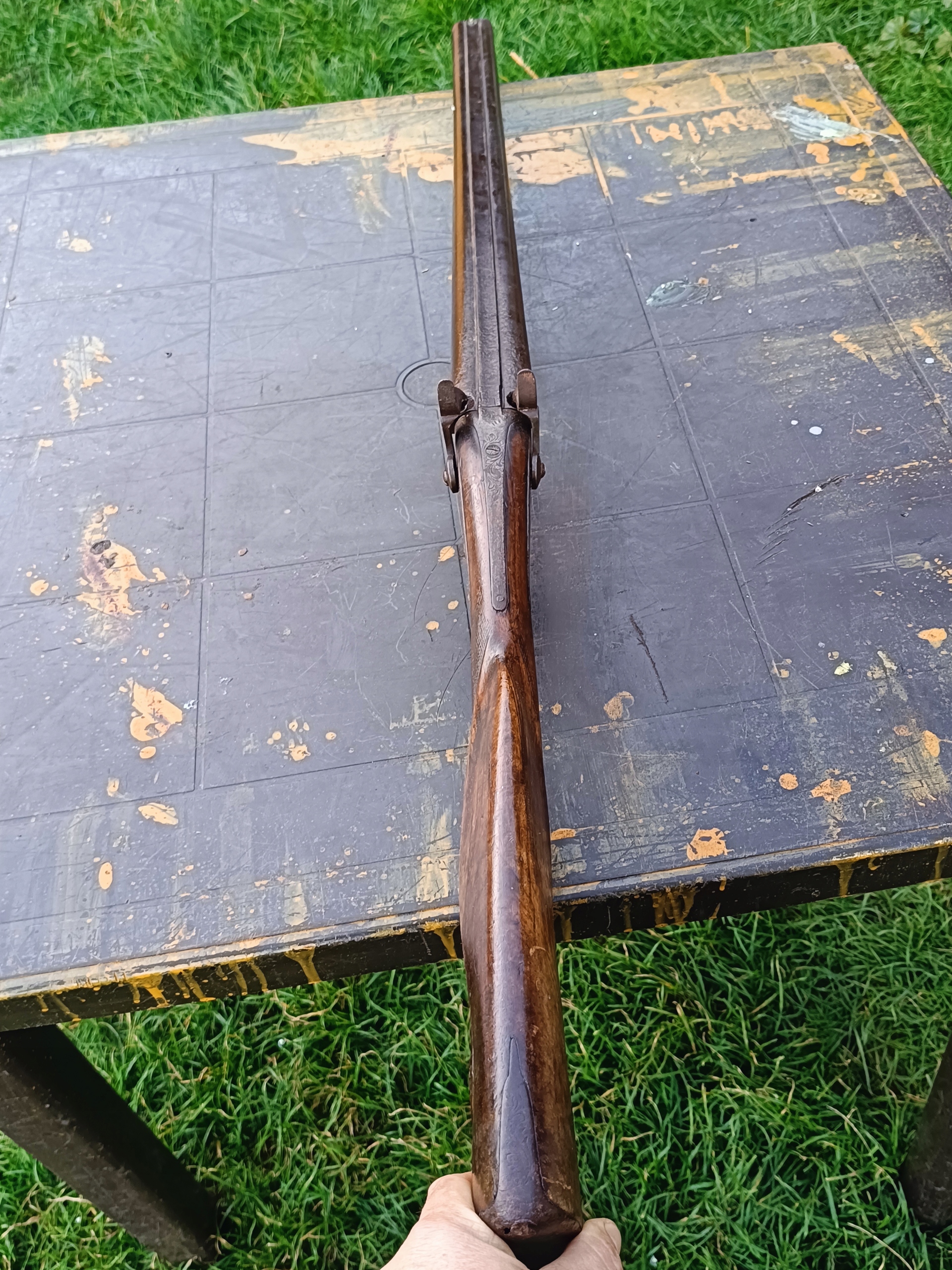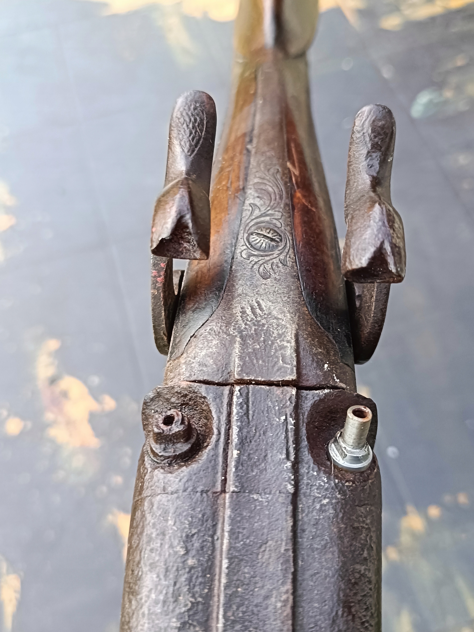 Загрузка спереди. Вы можете произвести сухой выстрел, двойную дро. Замки спускового крючка затягиваются на 2 хода. Прямой ствол в плохом состоянии из-за выбоин. Дерево без трещин, в относительно хорошем состоянии. Один камин заменили, но резьба у него оторвалась.