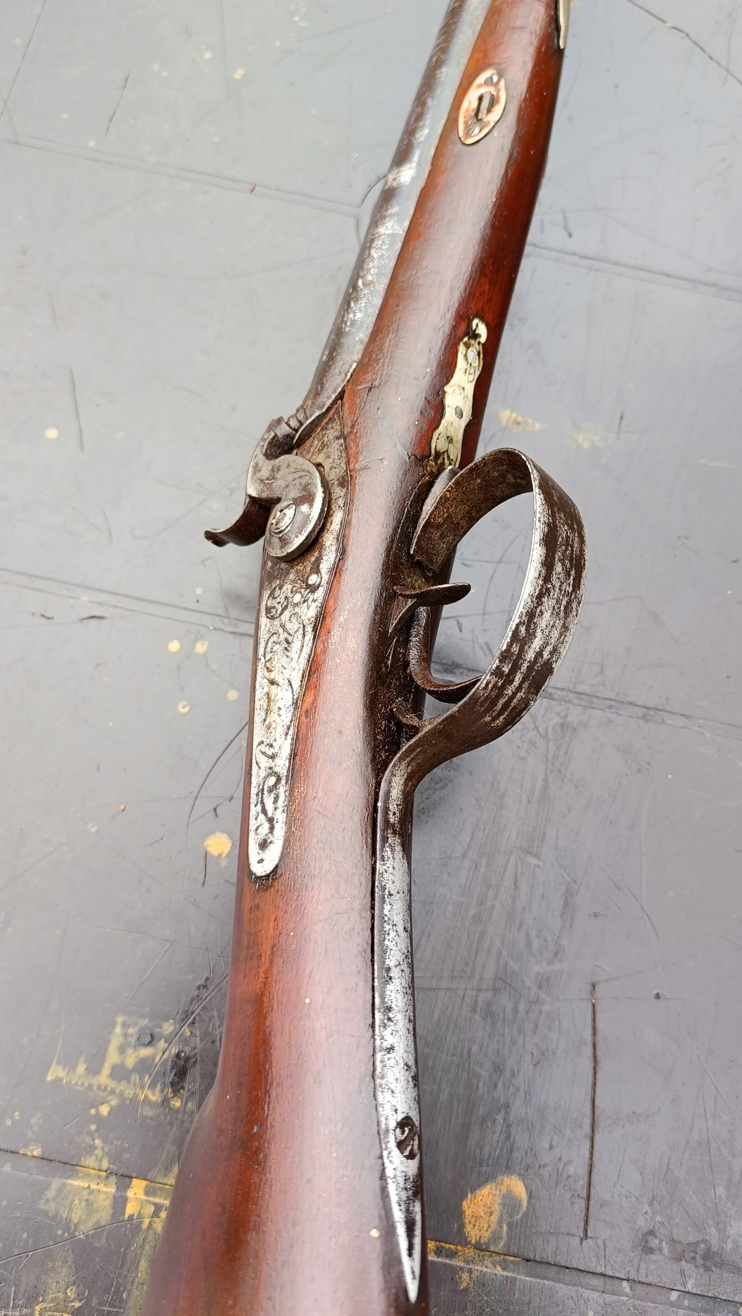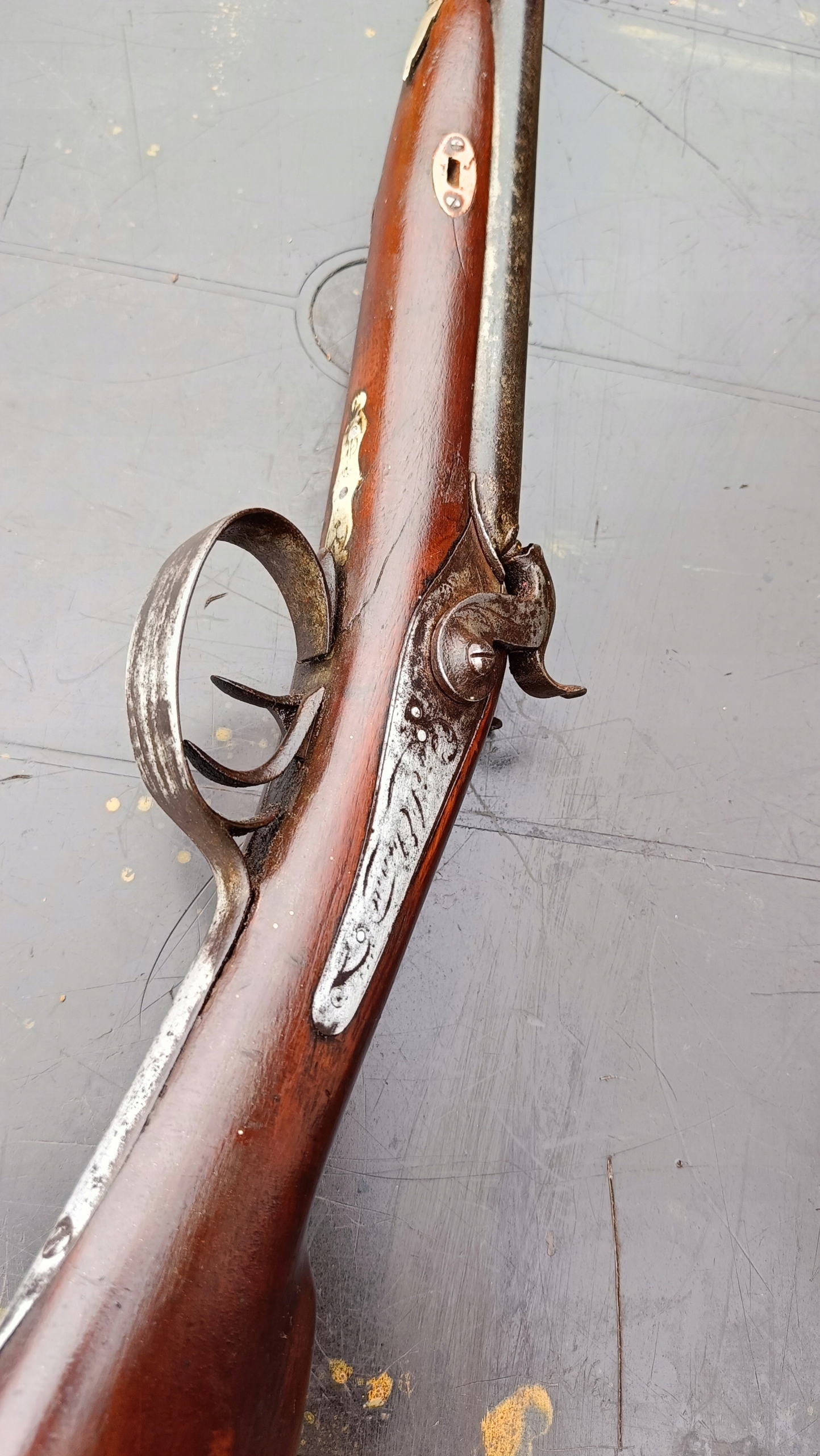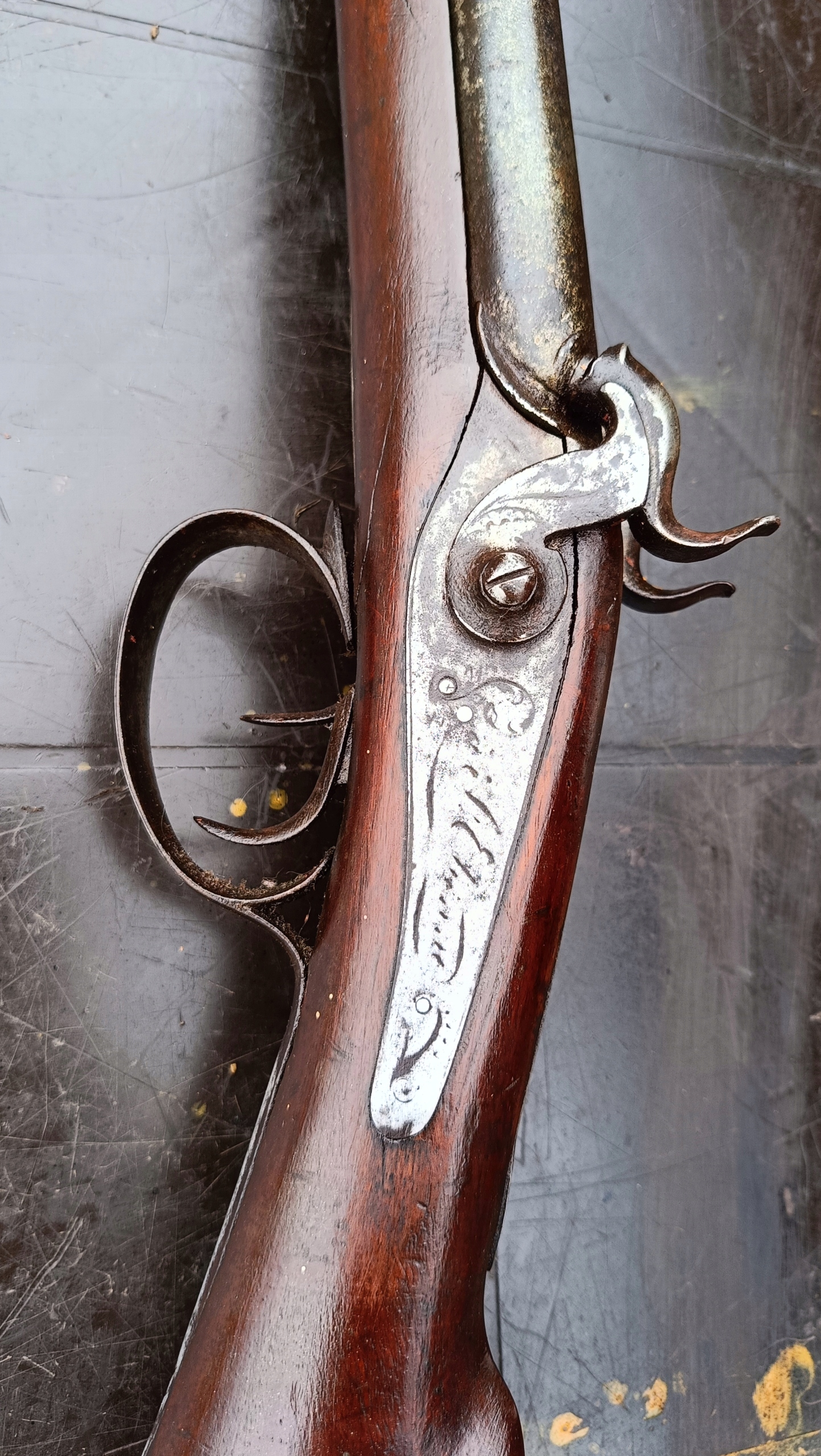 Загружается спереди. Вы можете произвести сухой выстрел. Спусковой крючок осуществляет запирание курка в два хода. Ствол в относительно хорошем состоянии – мушка отсутствует, возможно, ствол был укорочен. Дерево в хорошем состоянии. Камины необходимо заменить.