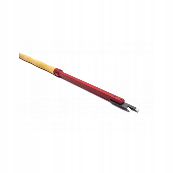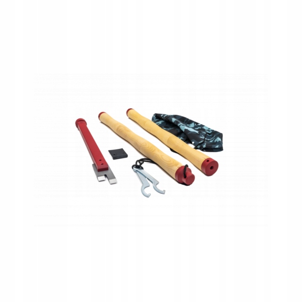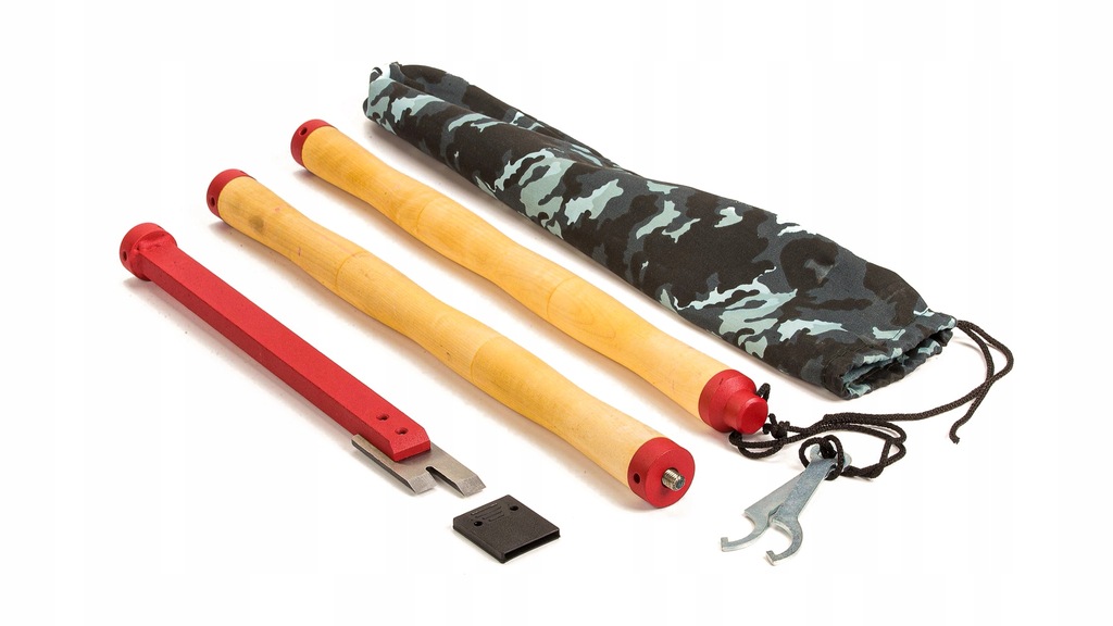 Две части, покрытые деревом, составляют рукоятку, третья часть - металлическая, к ней прикреплено большое поверхностное лезвие. раскрой.