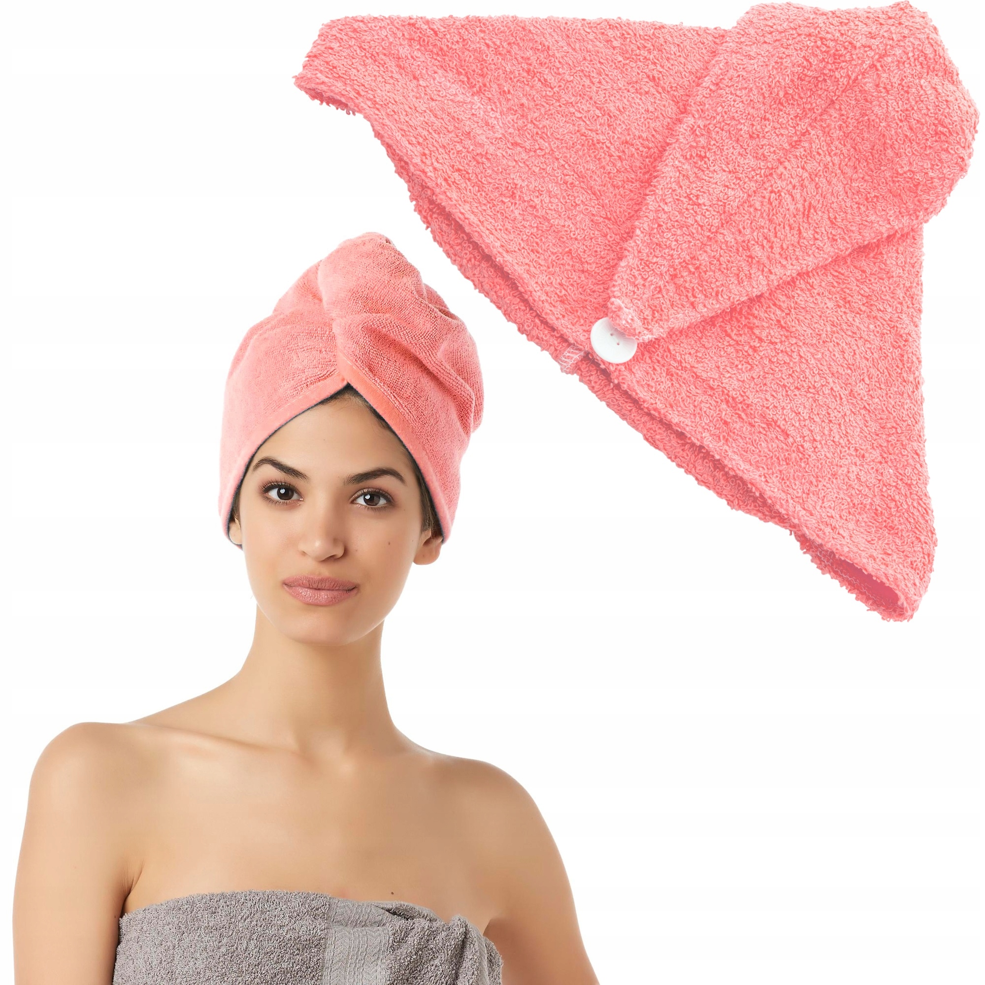 Форма полотенца разработана таким образом, чтобы его можно было легко надевать на волосы. У него есть практичная кнопка, которая обеспечивает устойчивость тюрбана.