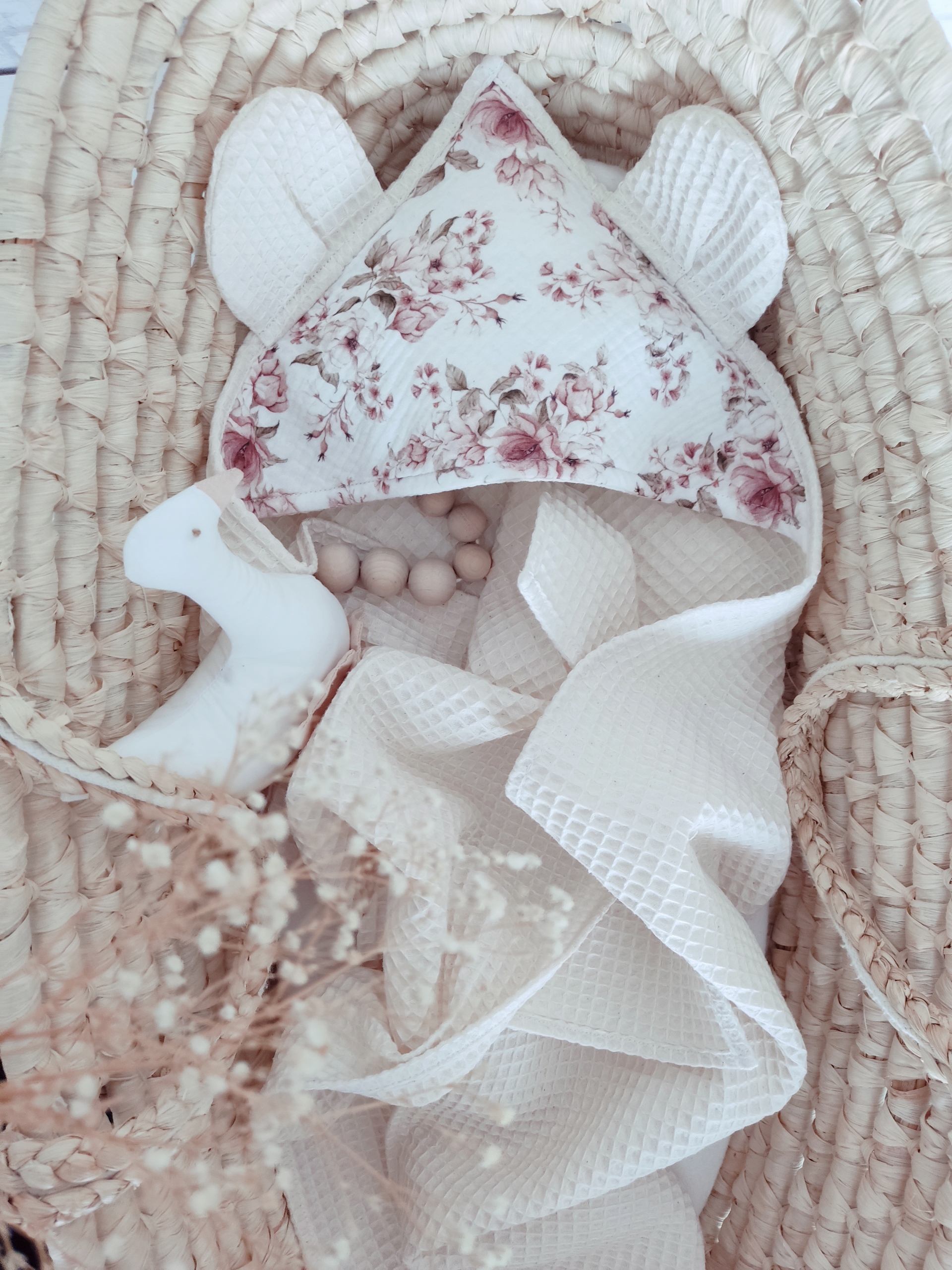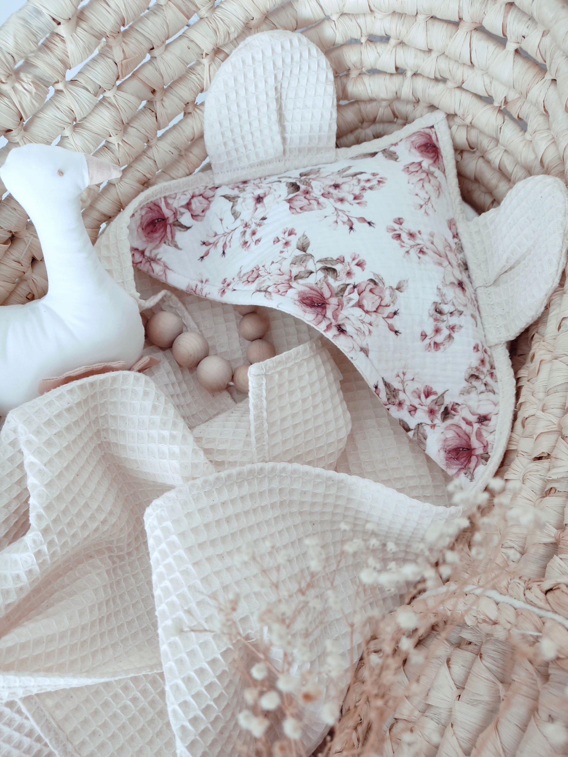 Красивое детское полотенце с капюшоном и pudlings из натуральной 100% хлопковой ткани и хлопковой муслины домашней ванной , и благодаря тому факту, что полотенце имеет капюшона мы также рады, что он перенесет его в пляж или пляж или Swampel . Его также можно использовать в качестве пеленки или одеяла.