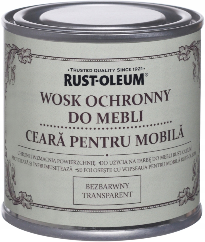 ВОСК ЗАЩИТНЫЙ ДЛЯ МЕБЕЛИ ОТ Ржавчины-OLEUM ПРОЗРАЧНЫЙ 125 МЛ ВОСК от Rust-Oleum для мебель рекомендуется для отделки и защиты элементов после нанесения меловых красок. Поскольку он бесцветен, он очень хорошо подчеркивает цвет или естественный цвет поверхности. Предназначен для нанесения на краски по дереву Rust-Oleum. Воск придает бархатистый блеск, а последовательная полировка добавит глубины и улучшит поверхность. Воск – это отделка и в то же время влагостойкая защита, эффективно изолирующая деревянные конструкции, например, от пролитых жидкостей, которые стекают или остаются на поверхности, подлежащей вытиранию. Тем более, что все следы повседневного использования очень легко удалить хлопчатобумажной тряпкой – это просто и удобно... :) Для повышения эффективности защиты мебели нанесение воска следует время от времени повторять. Свойства мебельного воска: