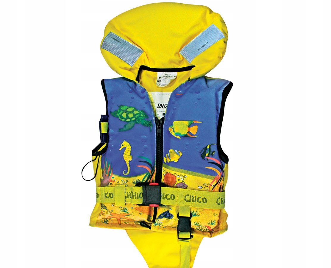 Спасательный жилет «Chico Baby». Он сертифицирован Польским Регистром Судоходства и CE ISO 12402-4, 12402-7, 12402-8. Разработан специально для детей. Для повышения безопасности используется широкий паховый ремень, который не дает ребенку провалиться сквозь нижнюю часть жилета. Застегивается на молнию и пряжку. Он удобный и легкий, покрыт прочным нейлоном. Он имеет светоотражающее покрытие SOLAS и незасоряющийся свисток для вызова помощи. Высокое качество. Предназначен для использования во внутренних и прибрежных водах.