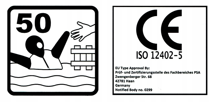 - Сертифицирован по стандарту ISO 12402-. 5 и соответствует европейскому стандарту плавучести 50 Н.