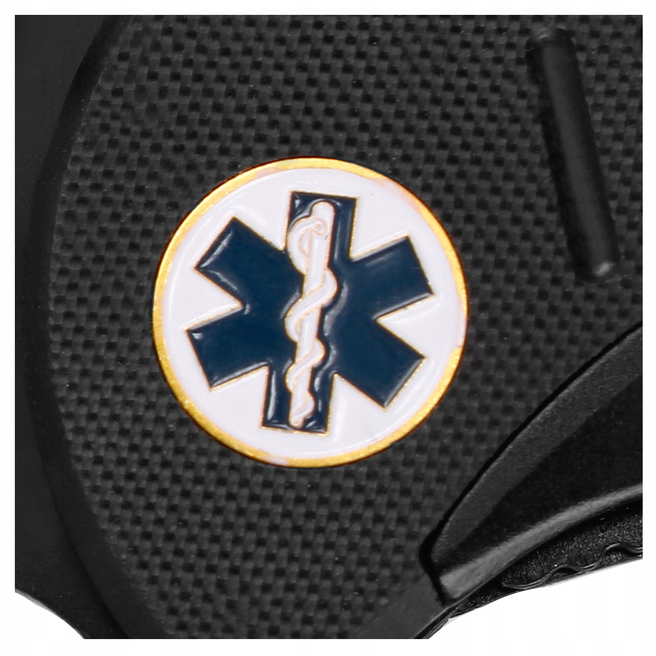 С одной стороны символ медицины и фармации, с другой - практичный зажим. благодаря чему нож можно закрепить на одежде так, чтобы он всегда был под рукой.