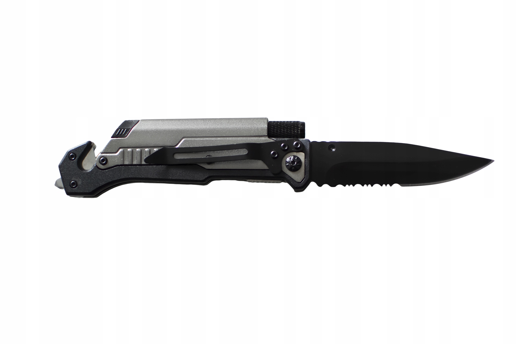 Производитель разместил на рукоятке функциональную клипсу, позволяющую безопасно переносить нож. На его конце имеется стеклобой и лезвие для быстрого разрезания ремня безопасности. На тыльной стороне ножа имеется скрытый зажигалка и мини-фонарик.