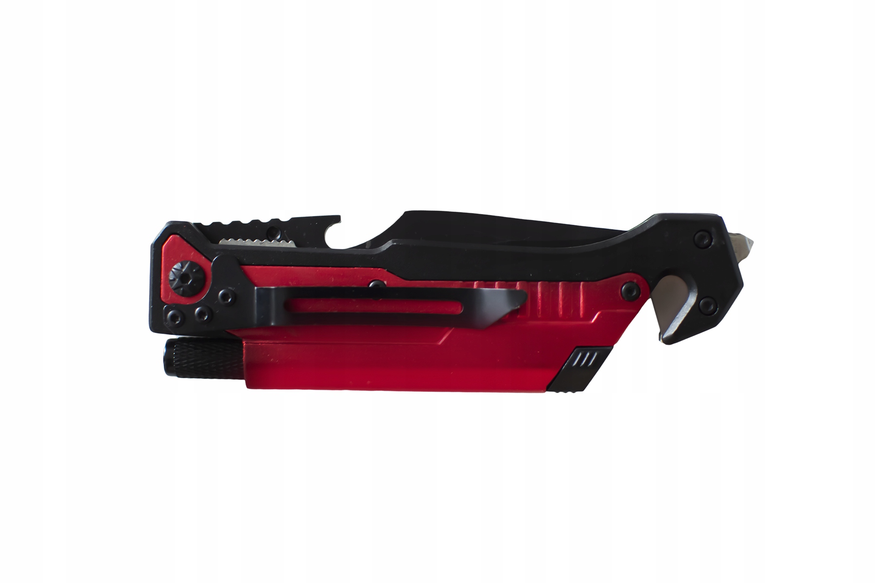 Производитель разместил на рукоятке функциональную клипсу, позволяющую безопасно переносить нож. На его конце имеется стеклобой и лезвие для быстрого разрезания ремня безопасности. На тыльной стороне ножа имеется скрытый зажигалка и мини-фонарик.
