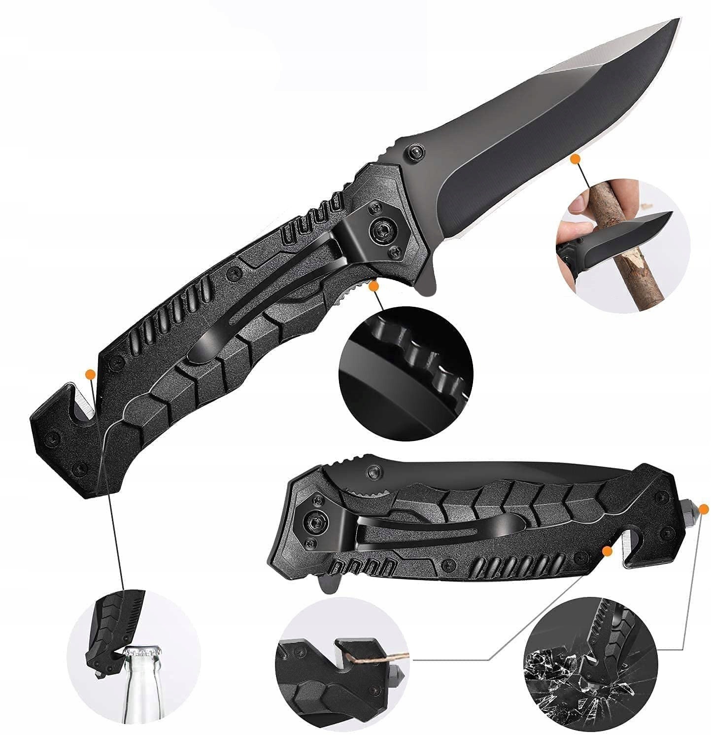 - ➕ Многофункциональный складной нож – с основным лезвием, пилой, резаком для верёвки и стеклобоем.