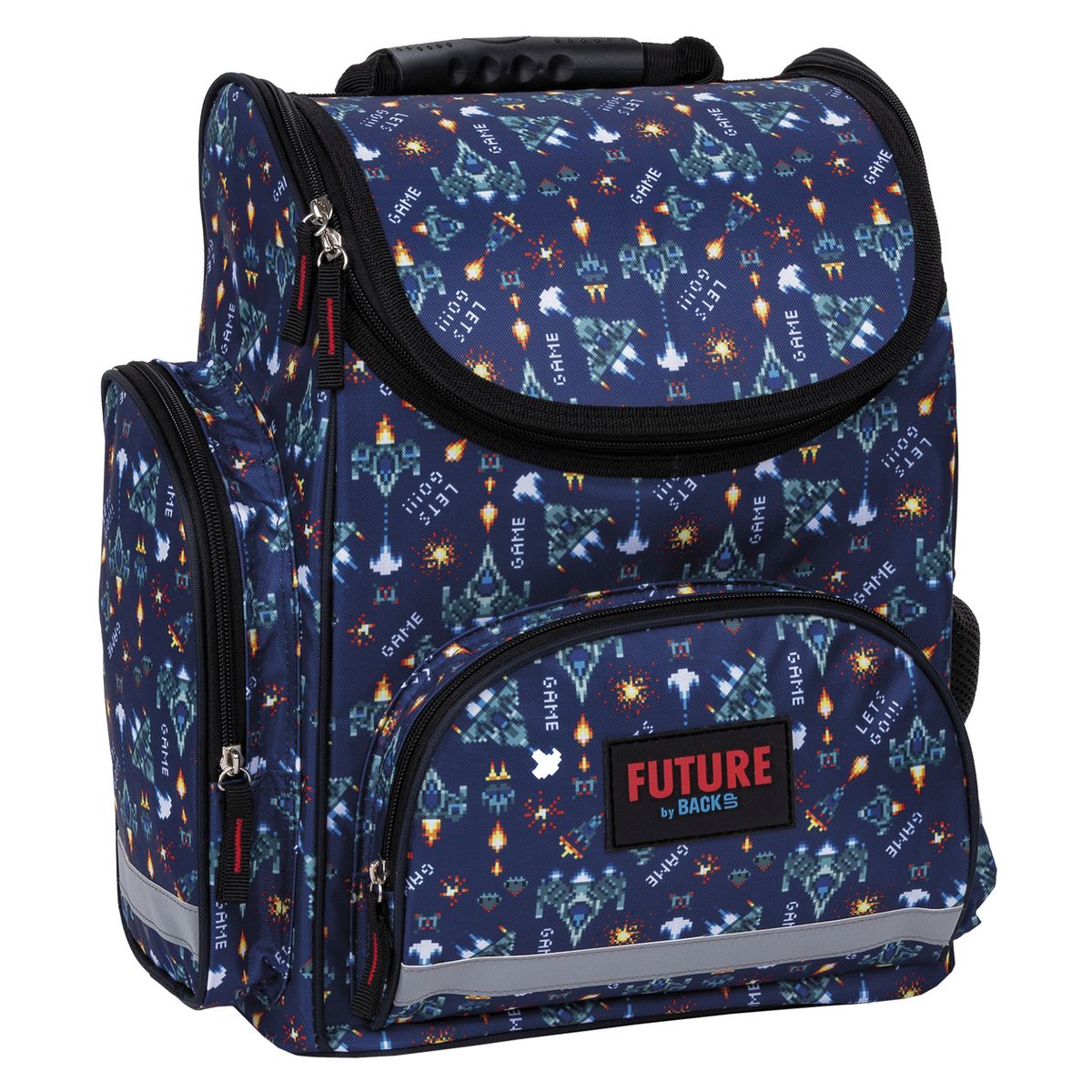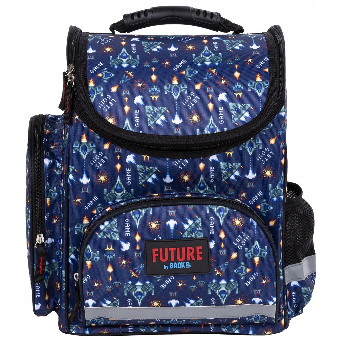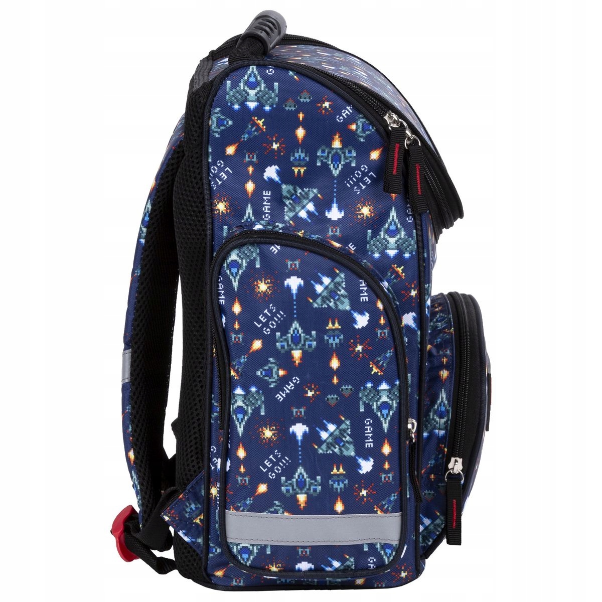 Крышка школьной сумки закрывается на молнию, внутри имеется бирка с адресными данными.