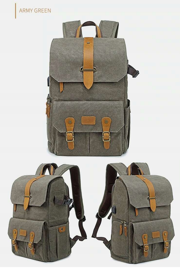 Рюкзак для фотографий Ansel XL b> — предложение для людей, которые ищут стильный рюкзак для фототехники. Он изготовлен из материала, похожего на холст, который благодаря специальному процессу пропитки со временем приобретает характерные потертости и изменения цвета, придавая рюкзаку винтажный стиль. б>. Данная модель отличается большой вместительностью — в ней можно разместить ноутбук с диагональю до 14,1 дюйма и фототехнику с объективами, кабелями, штативом, картами памяти, блоками питания и т. д. В основном отделении рюкзака имеется представляет собой специальный карман для ноутбука, закрепленный эластичной лентой на липучке. Пространство для переноски фотооборудования отделено прозрачным защитным клапаном на молнии. >предохраняет от случайного соскальзывания b> при открытии рюкзака. Имеются мягкие отделения, которые благодаря застежке-липучке можно свободно конфигурировать в соответствии с перевозимым содержимым. Также есть небольшой карман на липучке, например, для карт памяти и подключения к повербанку через внешний USB-порт, расположенный сбоку рюкзака. Отделение можно доступ осуществляется сверху через клапан рюкзака, застегивающийся на молнию и закрепляемый стильным ремнем, продетым через пряжку, а сзади и сбоку через клапаны, застегиваемые на молнии - их можно дополнительно фиксируется навесными замками (в комплект рюкзака не входят). Под верхним клапаном рюкзака расположен сетчатый карман на молнии. Боковой карман рюкзака позволяет переносить в нем штативы, другим вариантом их крепления и переноски являются съемные регулируемые крючки, расположенные в нижней части рюкзака. В передней части рюкзака имеется большой карман с тремя отделениями, застегивающийся на клапан на магнитных кнопках, спрятанный под стилизованными пряжками. На жестком дне рюкзака имеются резиновые ножки. Плечевые лямки и профилированная спинка рюкзака отделаны толстой дышащей губкой, повышающей комфорт при ношении. На лямках имеется дополнительная лямка на уровне груди, на пряжке которой имеется аварийный свисток.