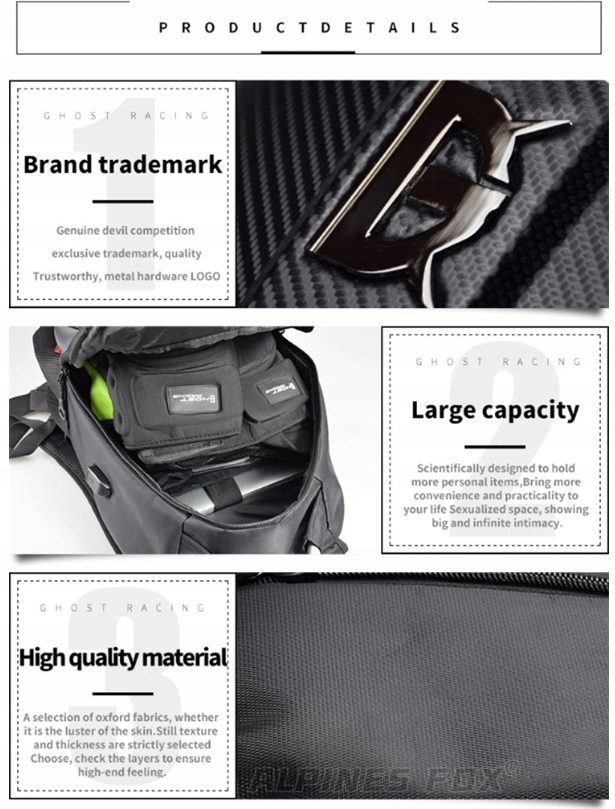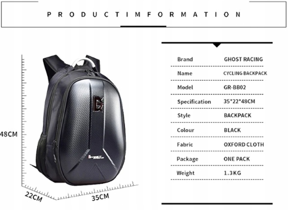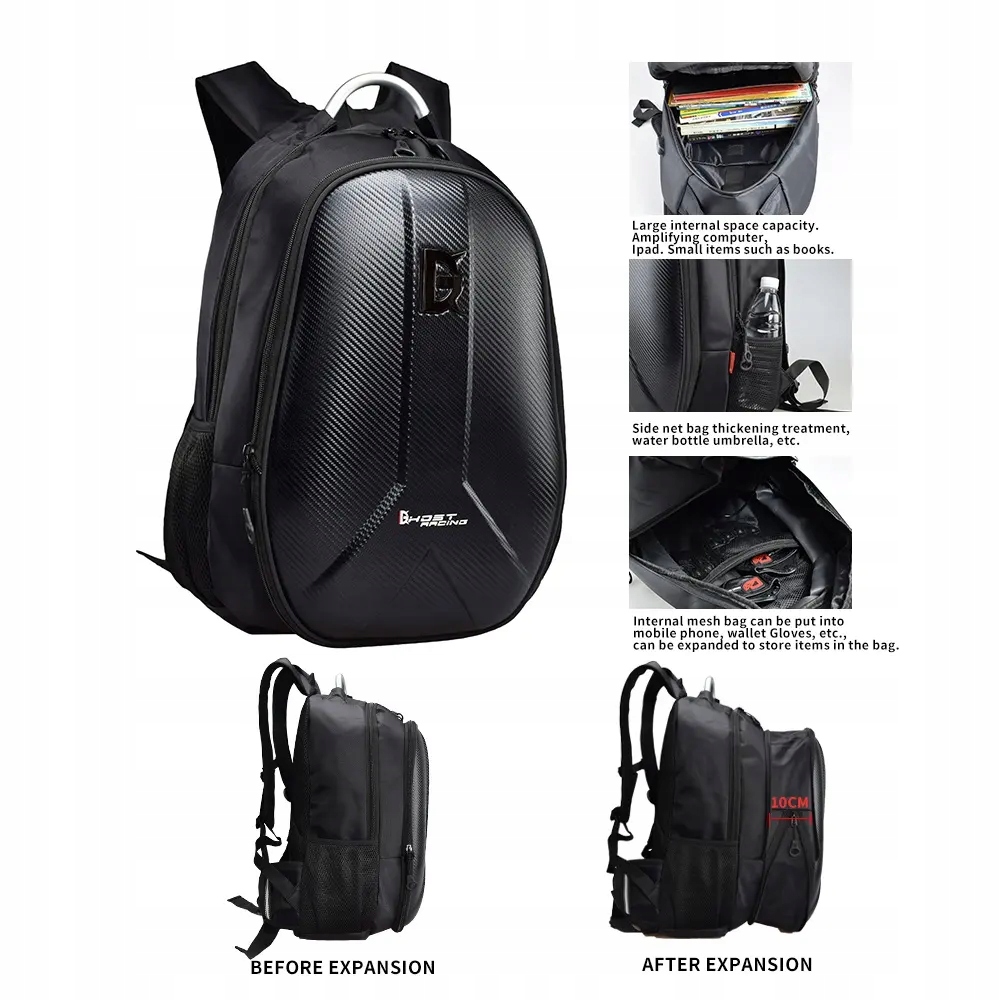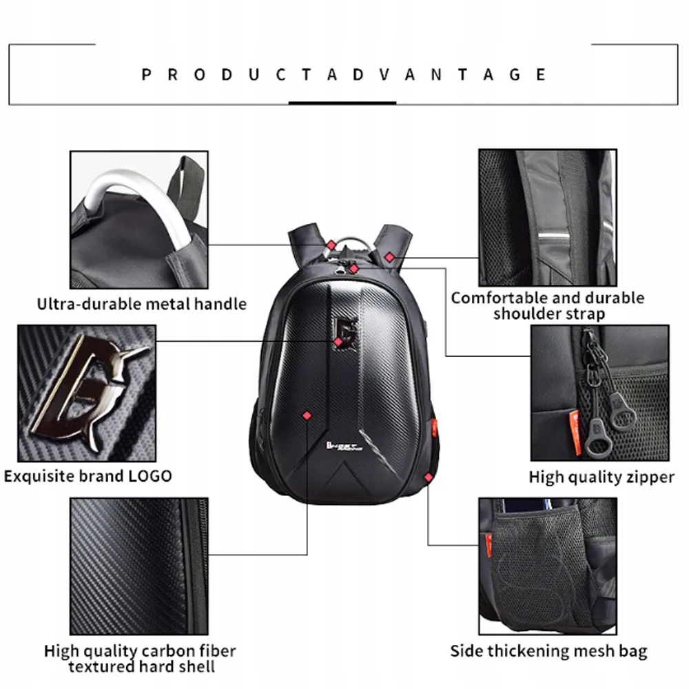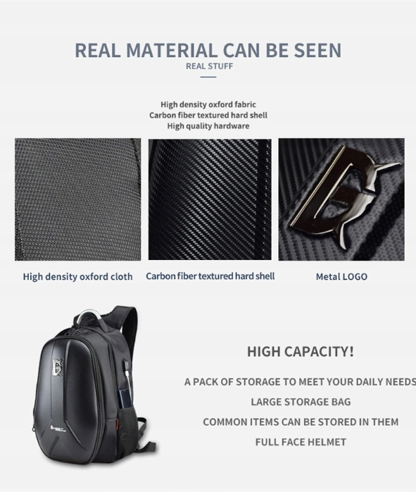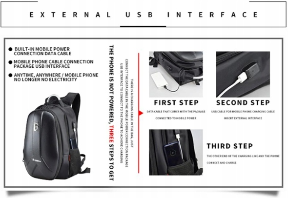 Описание: Универсальный мотоциклетный рюкзак из высококачественных материалов. Очень вместительный, внутри много практичных отделений. Он имеет специальный USB-выход (USB-кабель в комплекте) сбоку, что позволяет, например, заряжать смартфон, когда вы выходите из мотоцикла. Имеет возможность увеличения вместимости (легко поместится шлем).