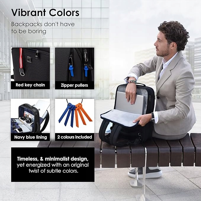Отличные материалы и классические цвета b>: мужской рюкзак с красивым сочетанием густо -ткани баллистического нейлона, гладкой кожи из микрофибры, черного металлического молнии и мягкой и пушистой плюшевой подкладки для ноутбука. Этот, казалось бы, один -корровой рюкзак имеет уникальные красочные вставки: настраиваемые синие или оранжевые молнии, оригинальная яркая синяя подкладка и красный ремешок.