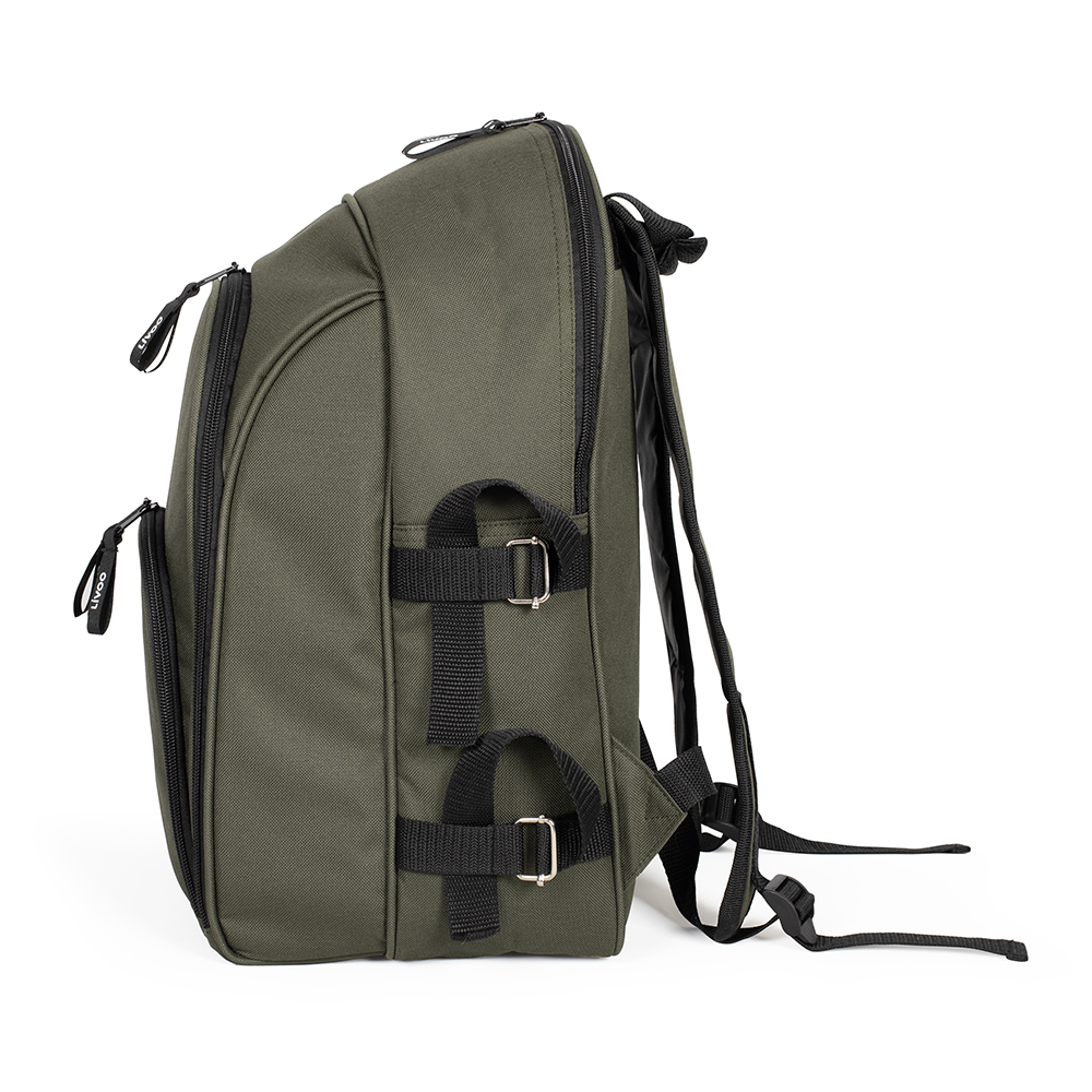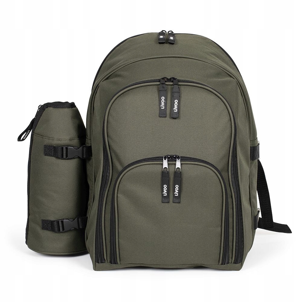 Рюкзак для пикника Livoo Практичный спутник для любого путешествия на природу, пешком или на велосипеде. Много места для еды и напитков. Здесь вы можете разместить все, что вам может понадобиться в поездке. Просто наденьте рюкзак на спину и отправляйтесь на природу. Рюкзак выполнен качественно и содержит все необходимое для подготовки отличного пикника. Рюкзак для пикника с богатым оснащением для четырех человек. Термическое пространство для хранения продуктов размером 43×28×8 см. Передний карман. Съемный держатель для бутылок с термоизоляционной вставкой. Размеры рюкзака: 45×40×23 см. Вес: 2 кг. Цвета хаки В комплект входят: 4 ножа, 4 вилки, 4 ложки, 4 тарелки, 4 чашки, 4 нетканых салфетки, 1 солонка и 1 перечница, 1 контейнер для масла, 1 открывалка для бутылок со штопором, 1 нож для сыра, 1 шт. деревянная разделочная доска