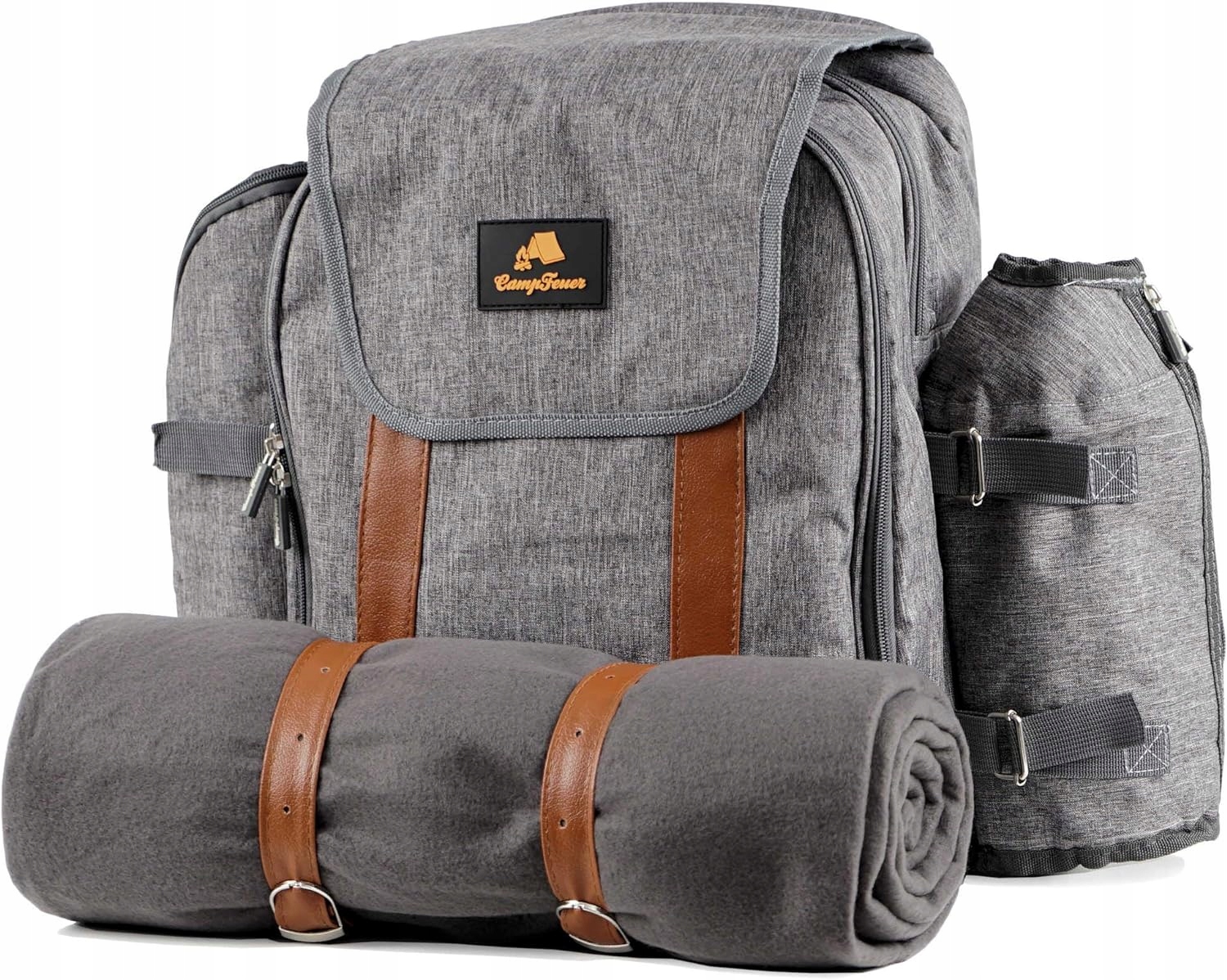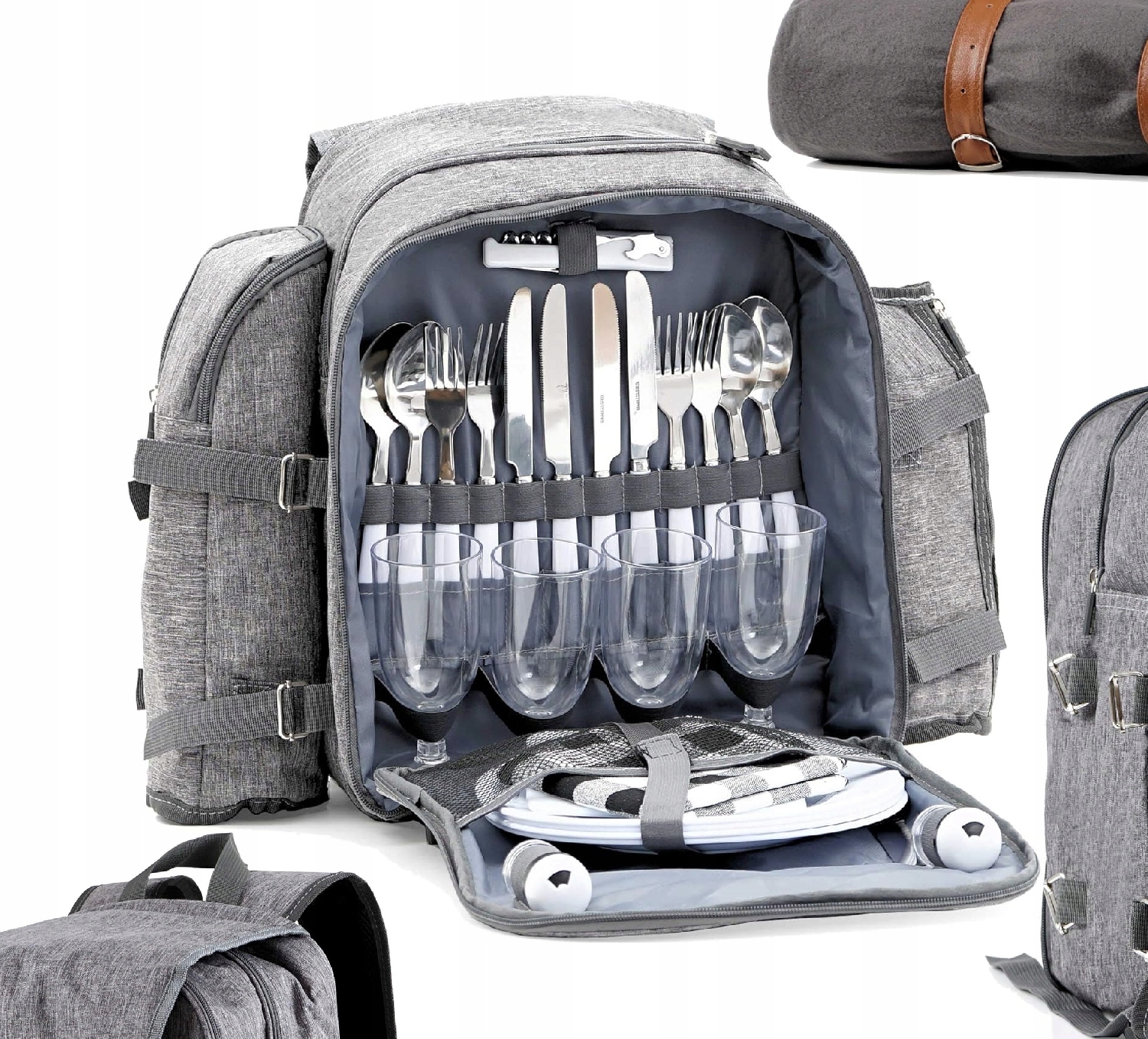 Рюкзак для пикника представляет собой полный комплект для 4 человек, идеально подходящий для пикника на природе. Там вы найдете все необходимое, в том числе: столовые приборы, стаканы, тарелки, салфетки, нож для сыра/хлеба, штопор, разделочная доска, солонка и перечница. Дополнительно имеются большие охлаждающие отделения, 2 сумки для бутылок и одеяло для пикника.