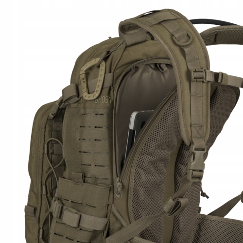Ghost-это 30-литровый масштабируемый рюкзак, который работает как трехдневный тактический рюкзак. Основная часть рюкзака содержит два застегированных молнии. Первый с назначенным пространством для системы гидратации и сетчатым карманом для аксессуаров. Второе с доступом с задней стороны идеально подходит для большого ноутбука. Третий карман рюкзака призрака создает извлеченный организатор. По умолчанию, прикрепленной к рюкзаку с четырьмя пряжками и гибким кабелем, его также можно использовать полностью автономно (имеет свою собственную транспортную ручку) для ношения, например. Внутри панели есть много отсеков и карманов, которые позволяют точную организацию перенесенного оборудования. Кроме того, этот карман, после завершения, создает «бобр -хэк», который позволяет нести одежду или более легкое оборудование. У самого рюкзака также есть четыре кармана, в том числе два по бокам, которые могут разместить бутылки с водой. Призрачные рюкзак широкие, с внутренней жесткой пеной и пряжками, которые позволяют вам быстро ломаться. Хип -ремень рюкзака создает полностью функциональный ремень в системе Molle/Pals, который можно легко вытащить, а затем использовать себя вместе с прикрепленными брекетами