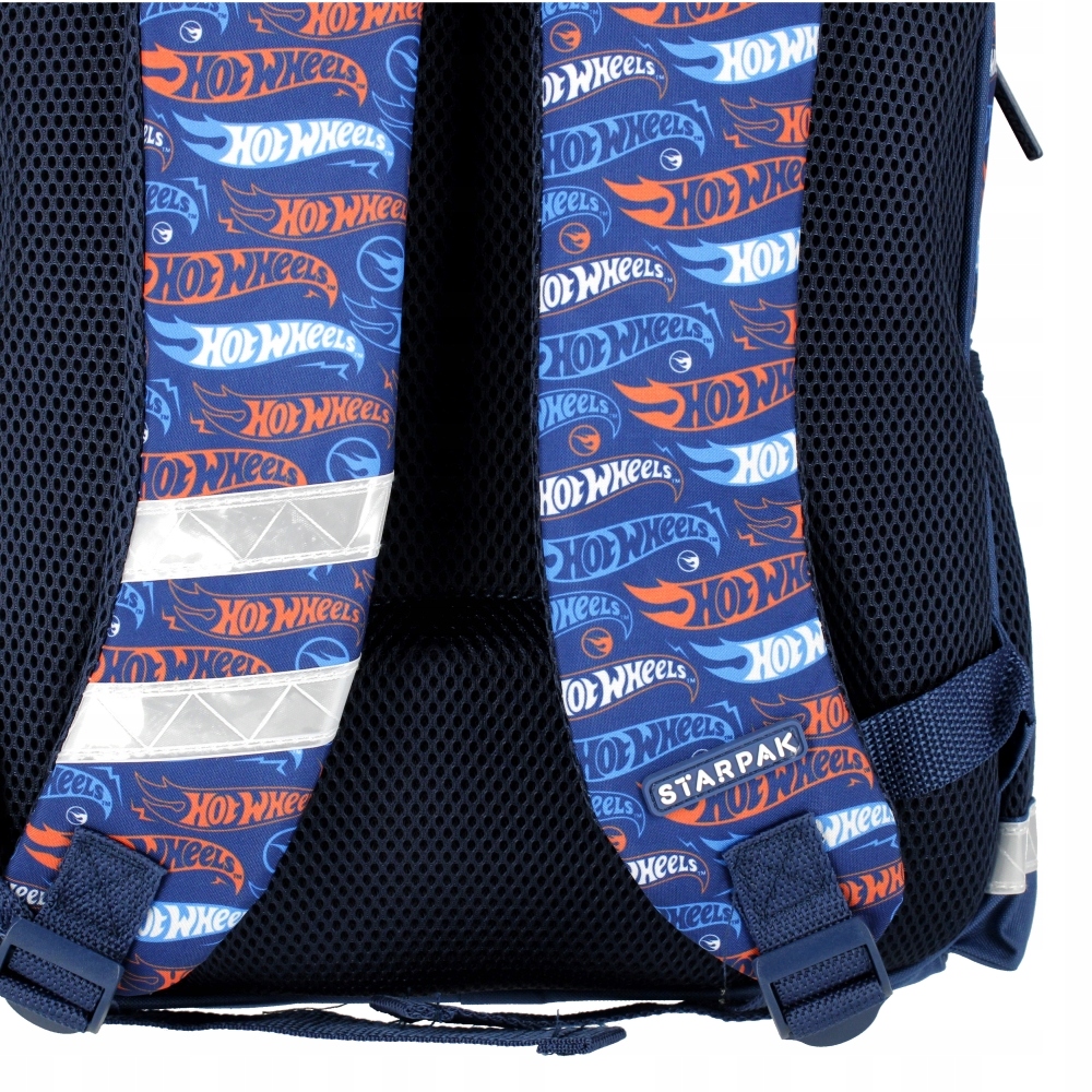 Преимущества: рюкзак состоит из 1 большого отделения и 2 вместительных передних карманов, 2 боковых усиленных сетчатых кармана для бутылки с напитком, прочные молнии, эргономичные спинка и лямки, спинка с системой вентиляции для большего комфорта, толстые, мягкие лямки защищают плечи, регулируемые лямки позволяют подогнать рюкзак под рост и тип телосложения, прорезиненная ручка позволяет повесить рюкзак на вешалку или удобно носить в руке, светоотражающие полосы на лямках, боковые карманы и спереди, повышая видимость рюкзака в ночное время и безопасность ребенка. Рюкзак в темно-синем и синем цветах. Удобный и функциональный школьный рюкзак STARPAK с лицензией Hot Wheels. Пользоваться таким рюкзаком – сплошное удовольствие. Также ознакомьтесь с другими продуктами STARPAK, предназначенными для молодежи. Изготовлен из прочного материала со светоотражающими элементами для большей безопасности. Рюкзак представляет собой текстильное изделие. Предназначен для детей от 3 лет. Размеры изделия: высота х ширина х глубина см: 41х30х20, вес изделия, кг: 0,65 кг. Объём рюкзака 23 л. Рюкзак упакован в плёнку. Коробка из 12 шт.