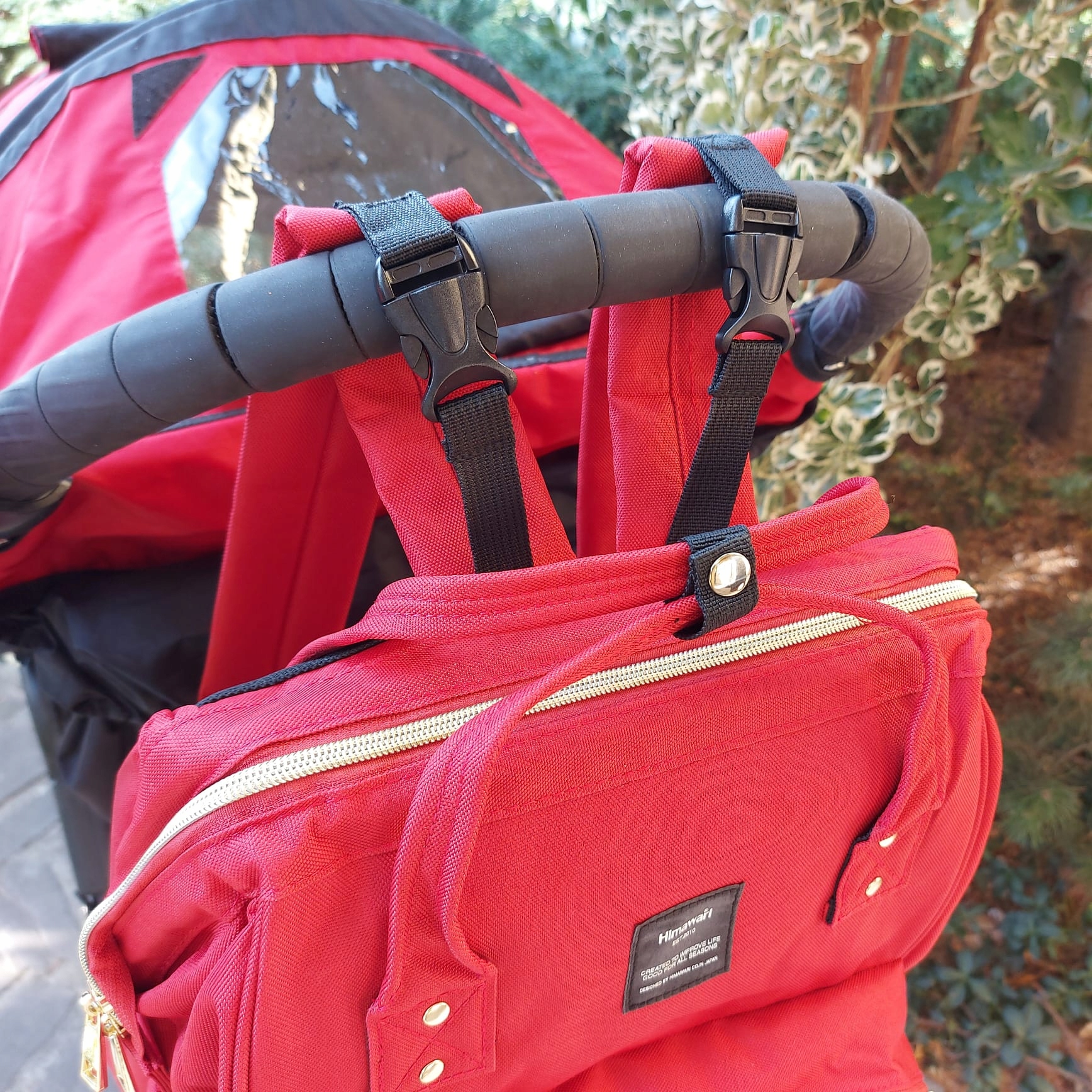 Есть два ремешка. Рюкзак застегивается на лямки для крепления рюкзака к ручке коляски.