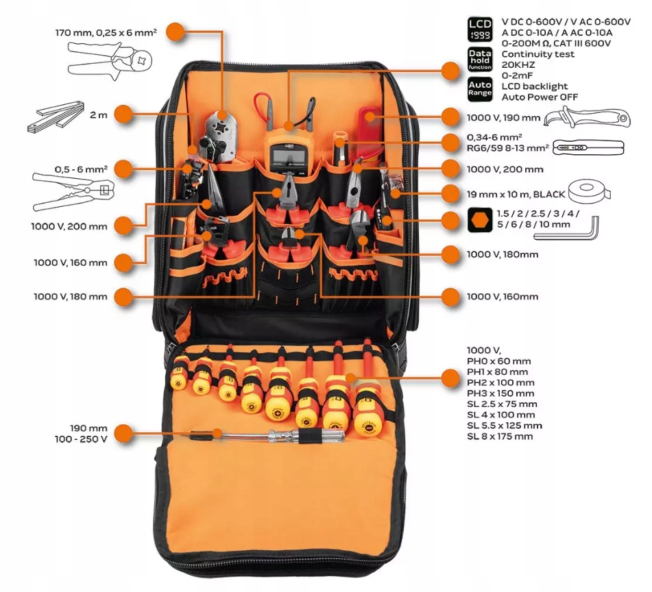 Комплексный набор рюкзака электрика, оснащенный 31 основным инструментом от NEO Tools, является идеальным предложением как для профессиональных электриков, так и для любителей. Он обеспечивает удобство переноски и организации инструментов в просторном рюкзаке емкостью 20 литров, с 7 внешними и 19 внутренними карманами. Рюкзак NEO Tools изготовлен из прочного полиэстера плотностью 600 D, имеет прорезиненное основание и жесткий каркас, обеспечивающий устойчивость и долговечность. Этот большой мобильный набор NEO TOLS для электриков упрощает электромонтажные работы, обеспечивая легкий доступ к инструментам в одном месте и значительно повышая эффективность при выполнении задач.