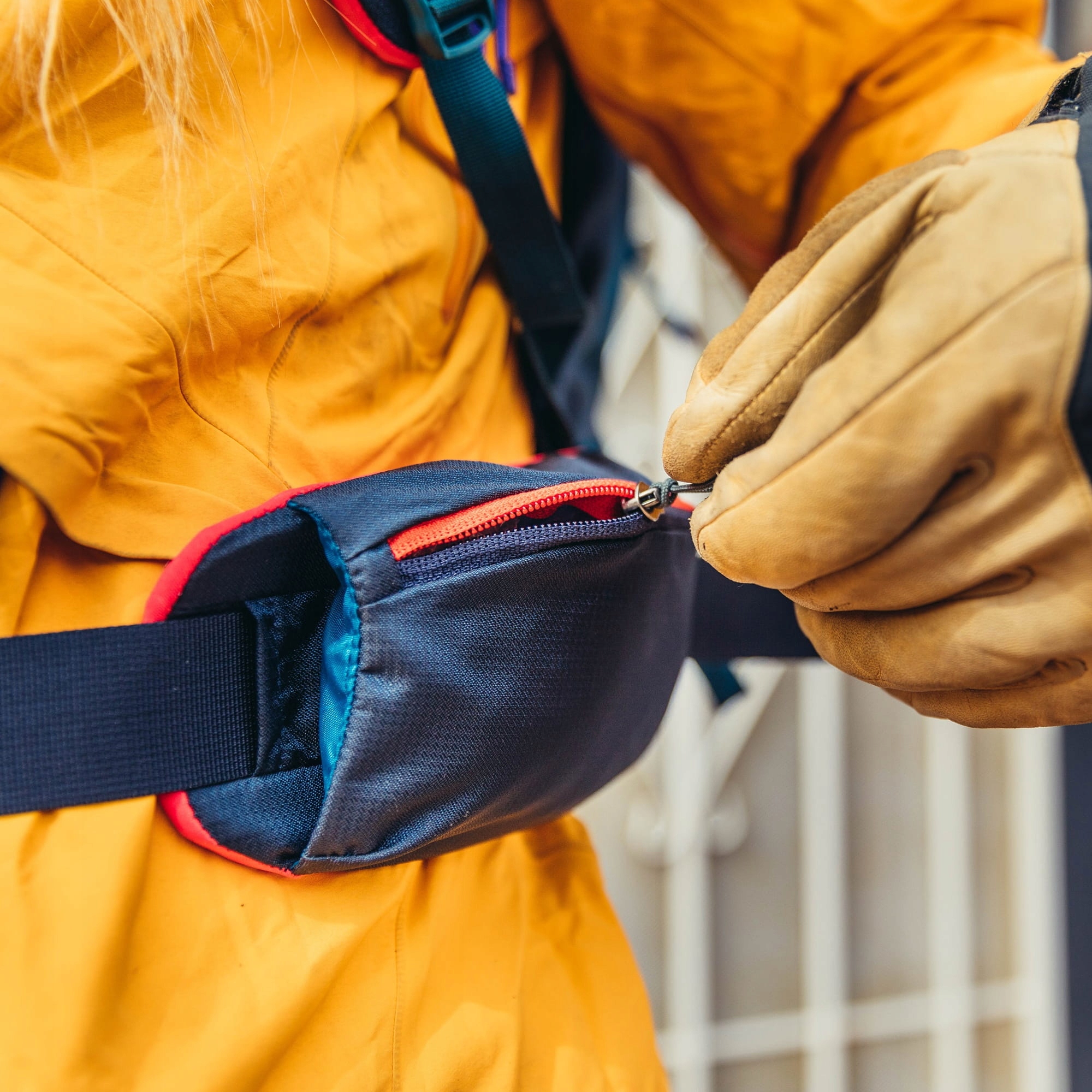 Система поддержки FusionLite поддерживается профилированными скобками с регулируемым грудным ремнем и свистком. Передняя панель рюкзака позволяет надежно установить две оси льда, которые вы можете скользить в широкие петли на нижнем крае. Кроме того, вы установите дополнительные аксессуары на передней части, благодаря шишнке в петлях Daisy Chep . С помощью винтовки вы можете прикрепить бутылку с водой или кепку от солнца.