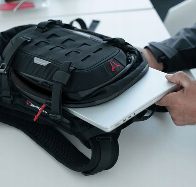 Рюкзак имеет усиленное переднее отделение с системой MOLLE, к которому можно прикрепить дополнительные сумки для аксессуаров SW-Motech.