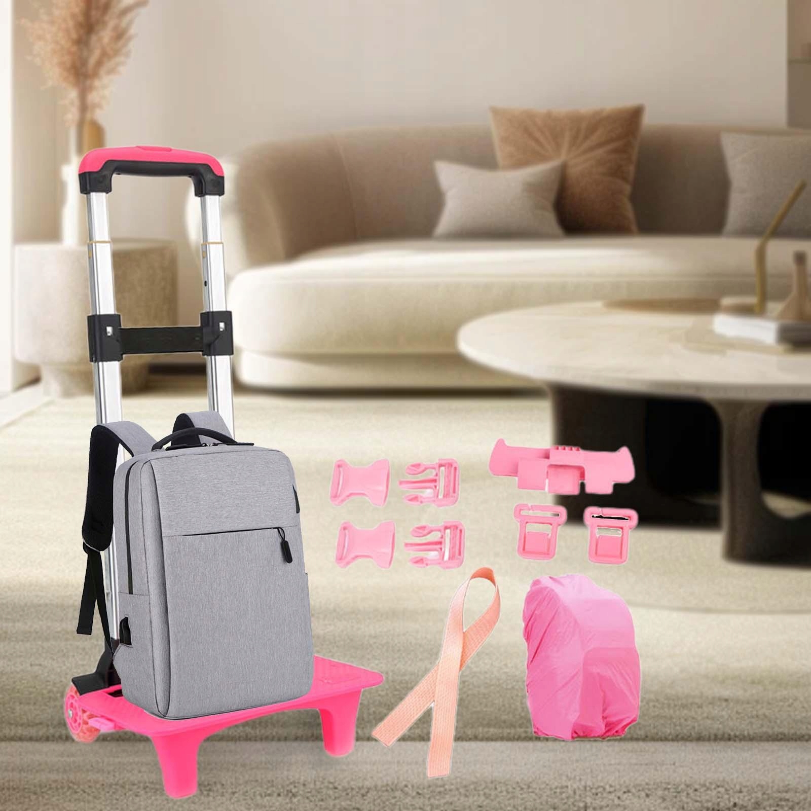 Рюкзак с телескопическим стержнем, сложенным с розово-красным дождем