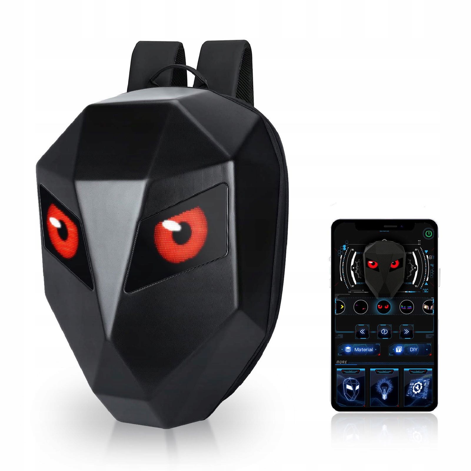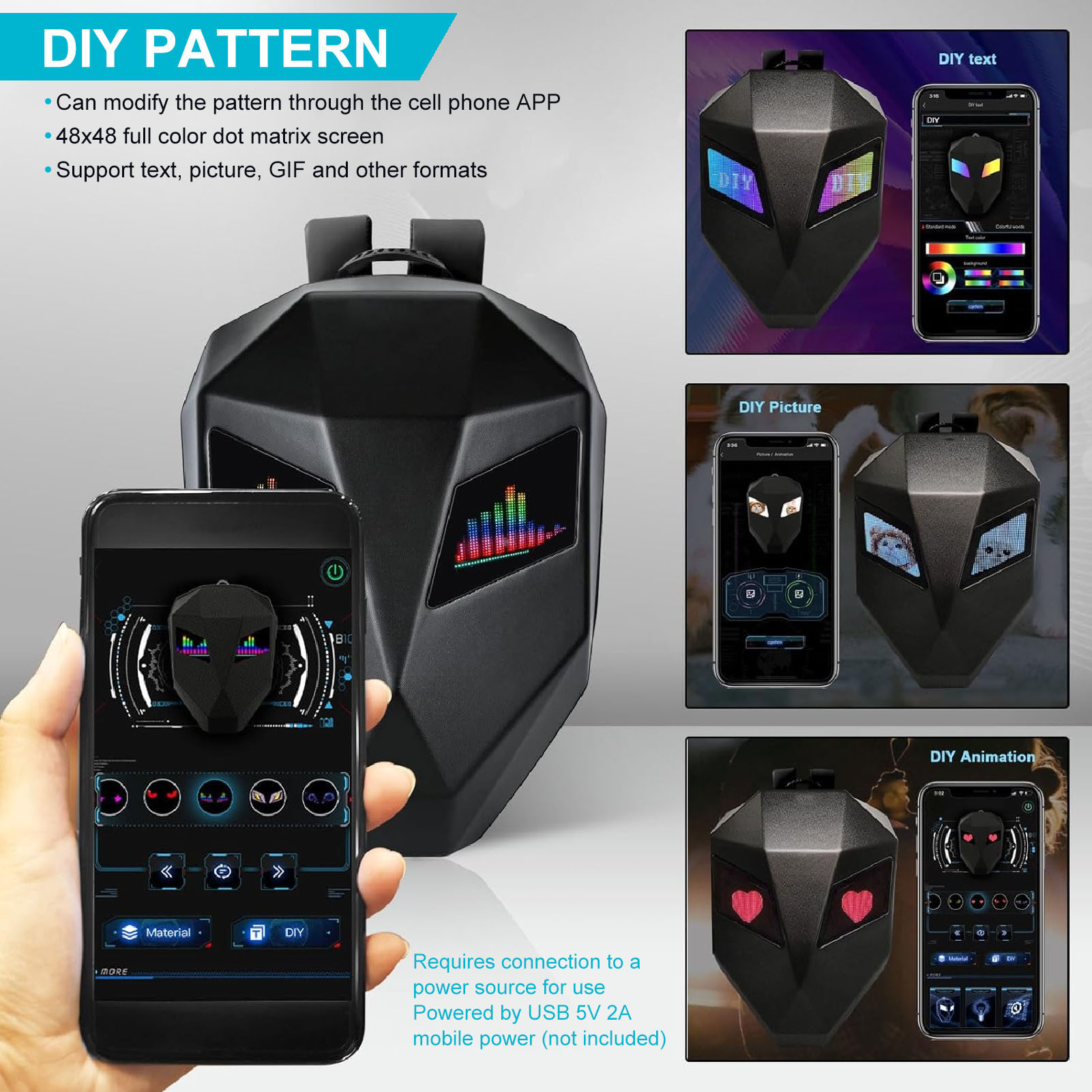 2. ВЫКРОЙКА «Сделай сам»: вы можете свободно изменять выкройку с помощью приложения для мобильного телефона. Этот мотоциклетный рюкзак со светодиодной подсветкой оснащен полноцветным матричным экраном 48x48 пикселей, поддерживает текст, фотографии, GIF и другие форматы.