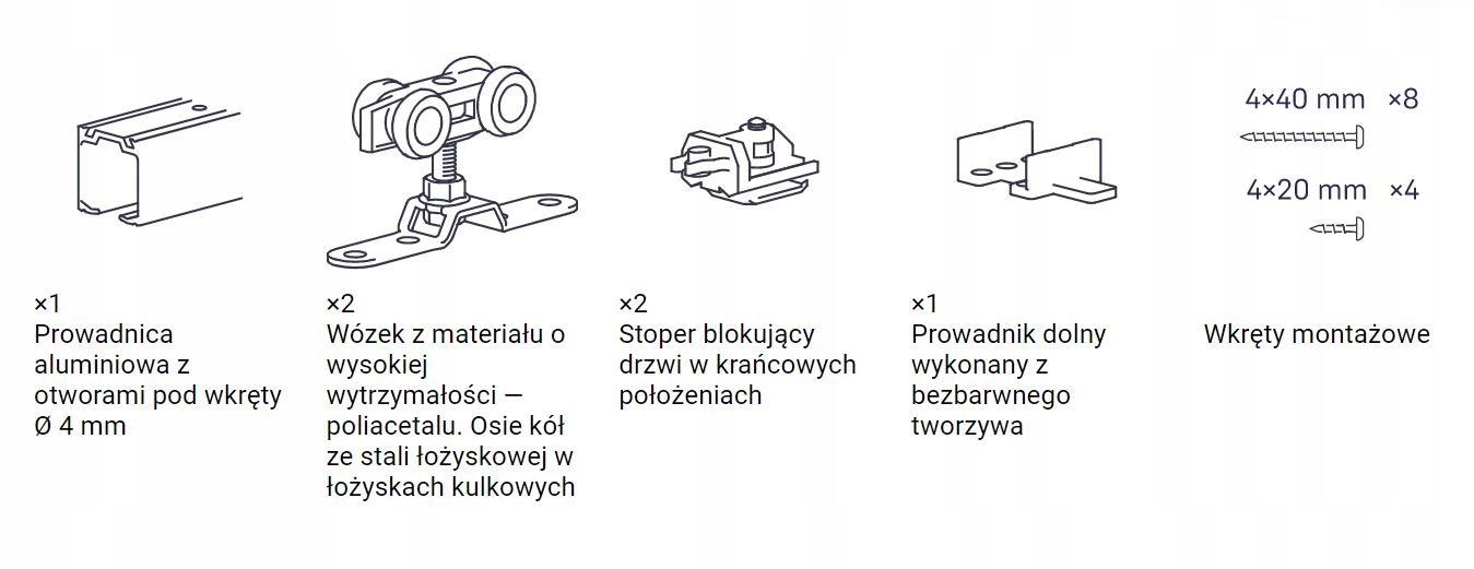 - В наличии дополнительные изделия: зажимы для крепления направляющей к стене, доводчик, держатели деревянной крышки или алюминиевая крышка с боковыми заглушками (в случае крепления к стене), алюминиевая крышка для планки (установка плоской крышка также возможна в случае крепления направляющей к потолку, необходимо использовать дистанционные втулки)