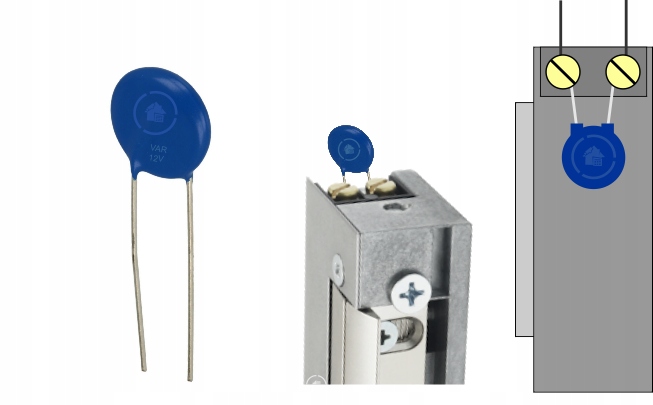 Мы рекомендуем использовать варистор вместе с электрозащелкой. Защищает электрозащелку и систему контроля доступа от повреждений, вызванных скачками напряжения. Его основная функция – уменьшение так называемого электрические пики, негативно влияющие на электронные устройства в системах контроля доступа. Скачки напряжения возникают при снятии питания с катушки (электрозащелка содержит катушку). Варистор устраняет скачки напряжения выше 18 В в случае источника питания постоянного тока и выше 14 В в случае источника питания переменного тока.
