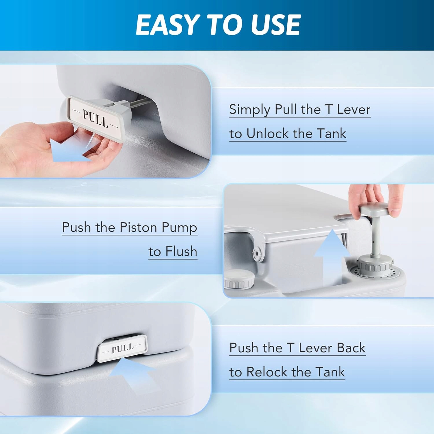 Портативный унитаз: портативный унитаз оснащен полноразмерным сиденьем и крышкой для комфортного использования детьми и взрослыми весом до 180 кг, обеспечивая комфортное купание, где бы вы ни находились.