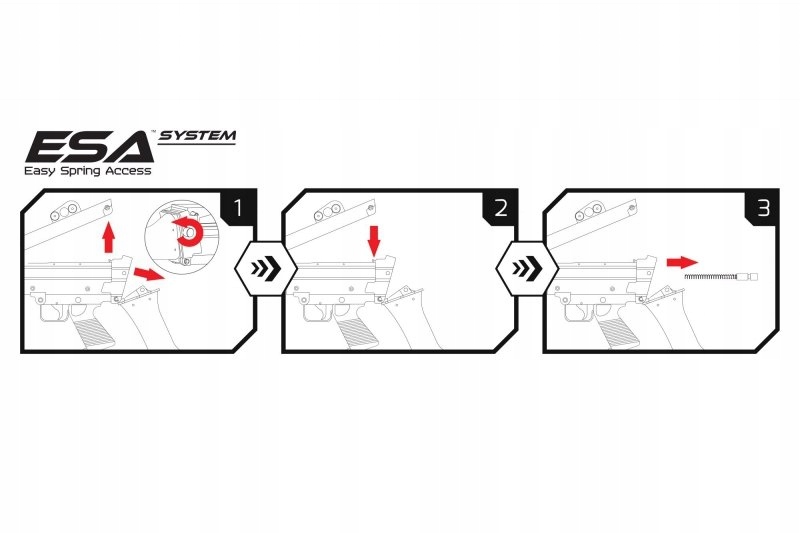 Система быстрой замены пружиныESA™, используемая в винтовке, позволяет быстро и эффективно регулировать мощность реплики в соответствии с ожидаемыми условиями игрового поля без необходимости посещения мастерской. или ряд специализированных инструментов. Сам процесс замены основной пружины занимает буквально несколько секунд – достаточно демонтировать один штифт, наклонить прикладной шарнир и вынуть направляющую с пружиной через отверстие в раме коробки передач.
