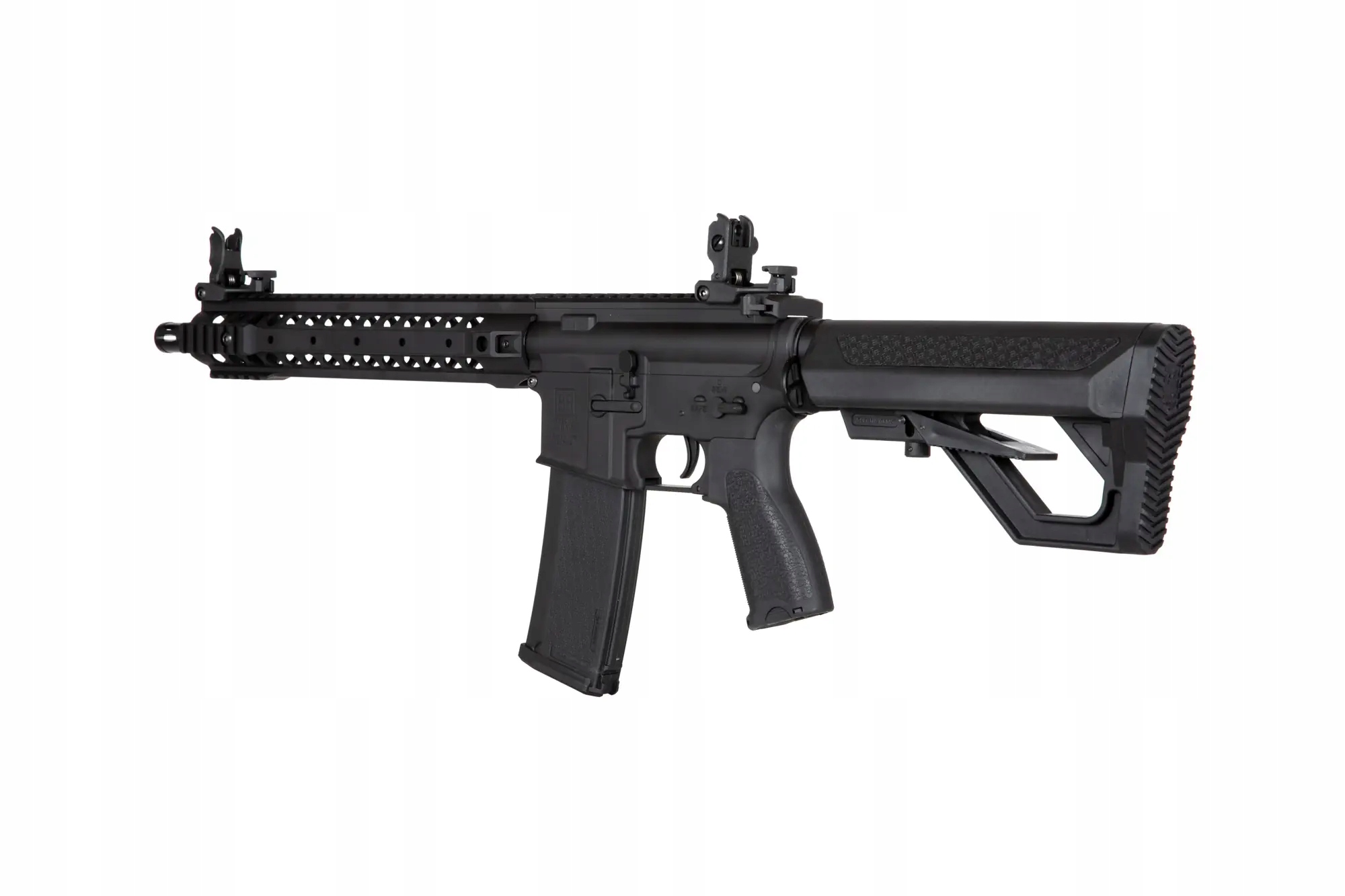 Реплика карабина SA-E06 оснащена передняя свободно плавающая планка в системе крепления 22мм RIS. Помимо длинной верхней RIS-рейки, на которой размещаются складные прицельные приспособления, реплика имеет короткую планку под стволом и по бокам планки .