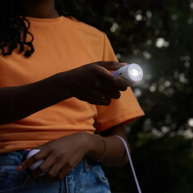 Оно оснащено фонариком мощностью 130 люмен и персональной сигнализацией интенсивностью 130 дБ,слышимой на расстоянии до 450 метров. Дополнительно в комплект входит элегантный футляр.