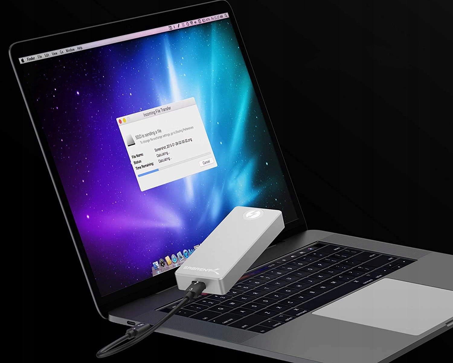 Дизайн без инструментов: заканчивать винтами! Это корпус на 100% подпрыгнут, что позволяет легко заменить диски. Просто поднимите заднюю часть корпуса, разблокируя ручку и скользите на диск! Специальный PIN -код сохраняет диск SSD на месте, что делает неприятности процесса! Технология Thunderbolt 3 позволяет вам достичь удивительной скорости до 1600 МБ/с.