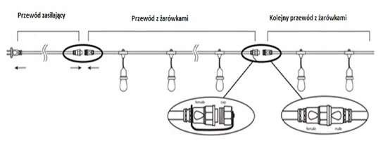Возможность соединить до 10 цепочек вместе. Максимальная длина связанного ряда гирлянд 200м, максимальная мощность 700Вт